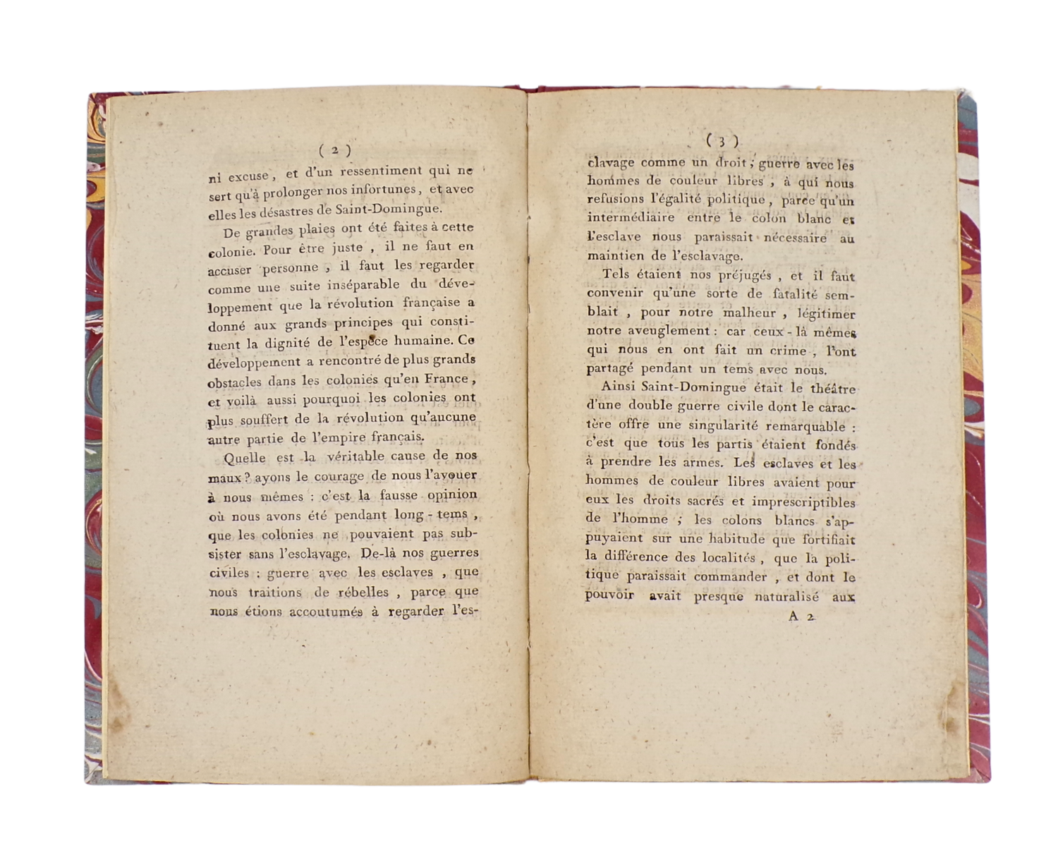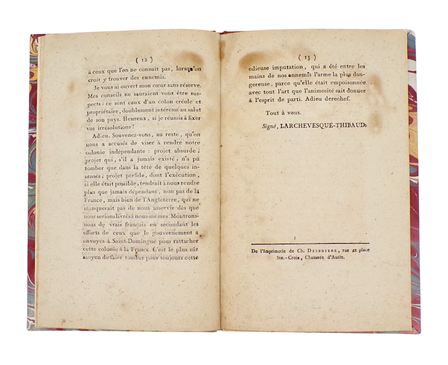 First and only edition of a memorandum by colonist Larchevesque-Thibaud during the Haitian Slave Revolt, in which he presents a fairly realistic and nuanced picture of the impasses of settler politics on the island. He took a more modest path towards the revolting formerly enslaved black population of the colony than most settlers did. For example, he invites the colonists to positively reassess Sonthonax's actions.