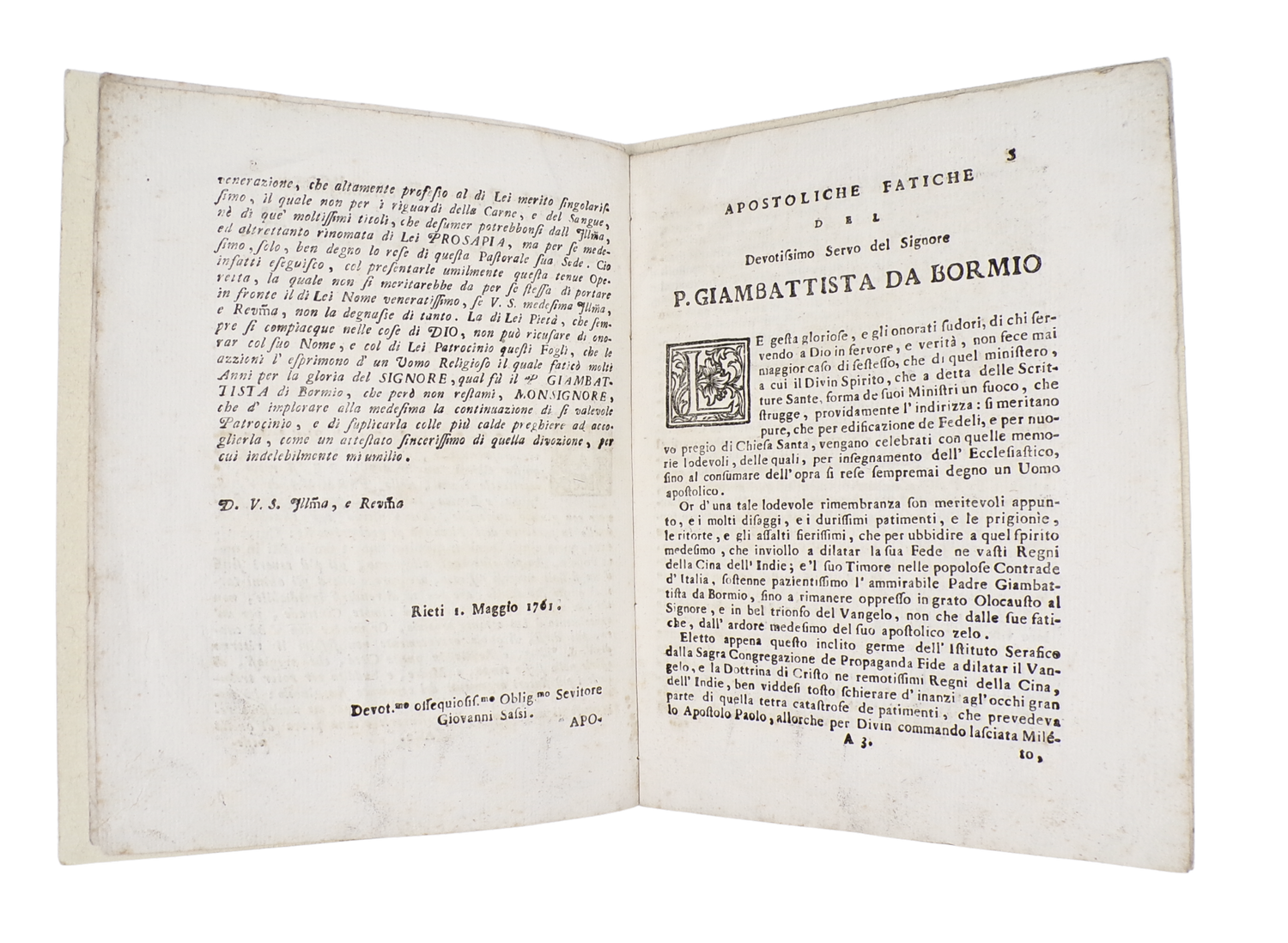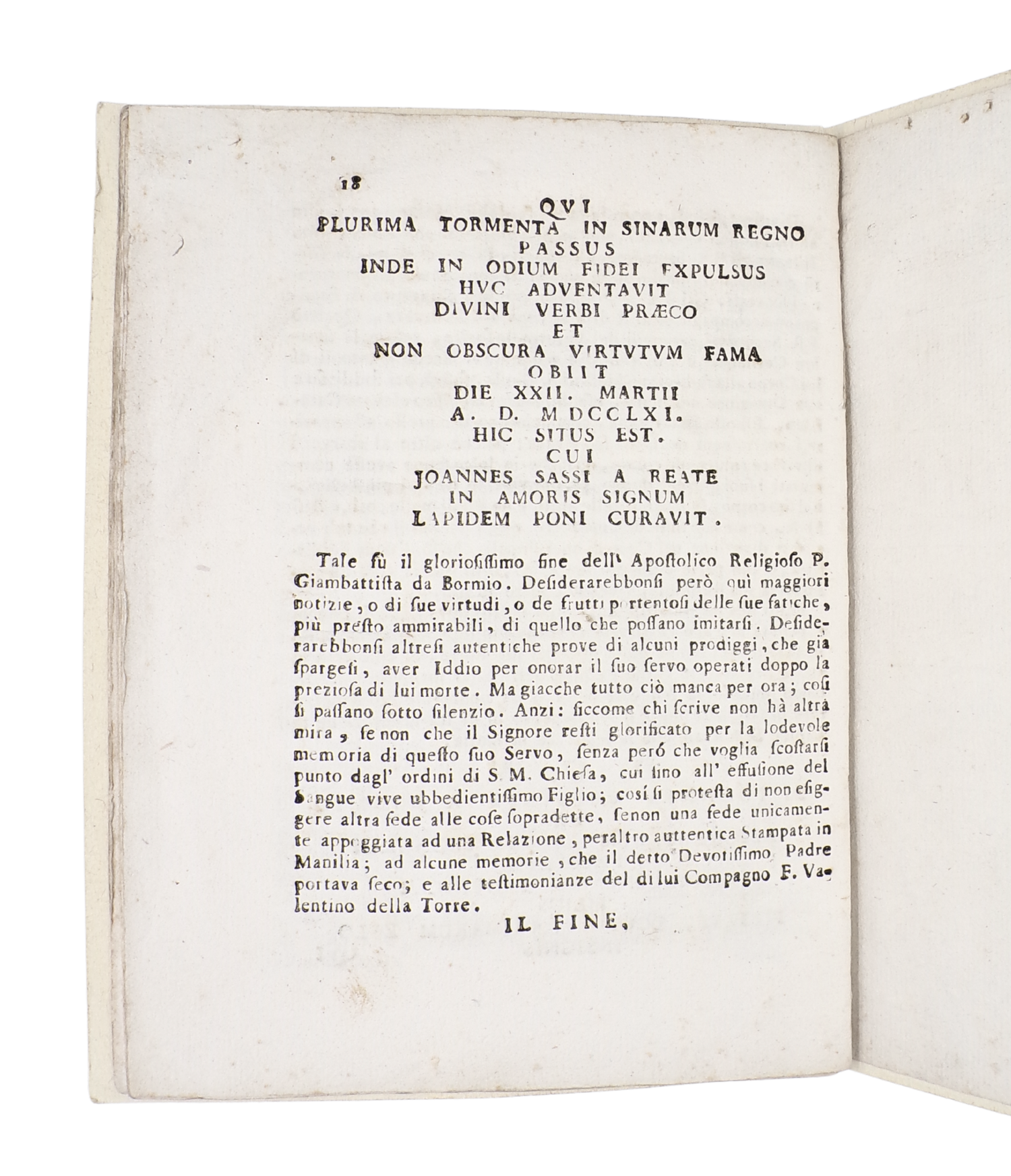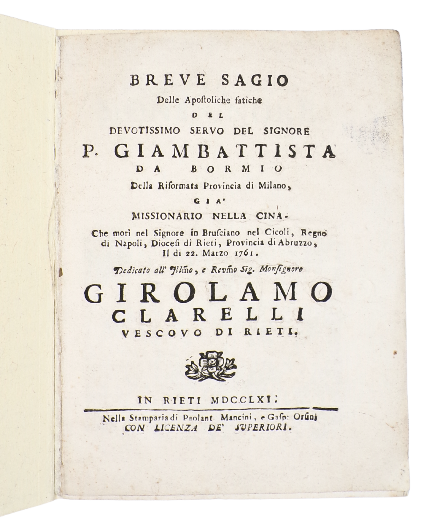 An extremely rare contemporary account of Franciscan missionary work in Asia during the mid-eighteenth century. Written by Giovanni Sassi of Rieti and printed in the year of Father the missionary Giambattista da Bormio’s death, the Breve Saggio provides one of the earliest Italian descriptions of a missionary’s ordeal under Qing repression of Christianity.