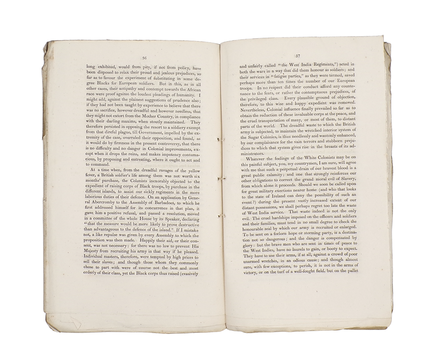 First edition of a scarce abolitionist pamphlet by James Stephen, the influential barrister, Member of Parliament, and one of the chief architects of the campaign to end the British slave trade. Stephen (1758–1832) was a close ally of William Wilberforce and played a central role in framing the Slave Trade Act of 1807, which abolished Britain’s participation in the transatlantic trade. In this later tract, published nearly two decades after abolition of the trade, Stephen denounces the continuing practice of slavery in Britain’s Caribbean colonies, arguing that the nation itself was morally “enslaved” so long as colonial bondage endured. His call to the electorate is both an indictment of vested West Indian interests and a rallying cry for immediate reform.