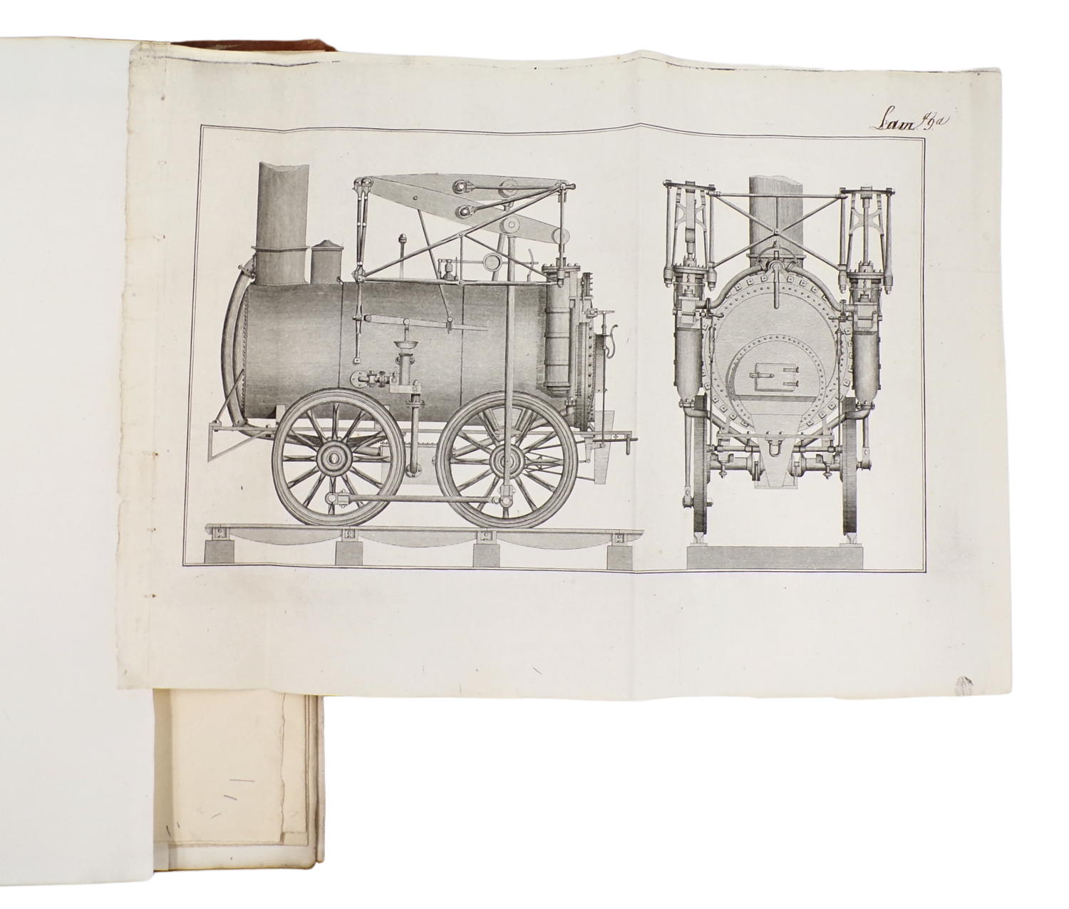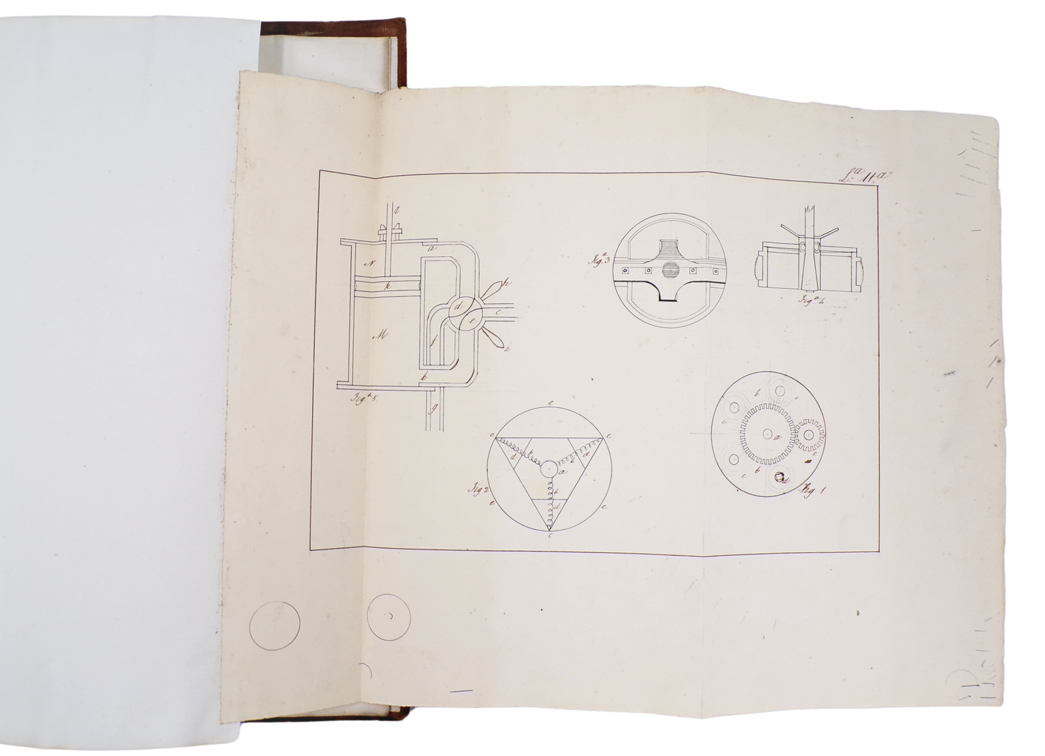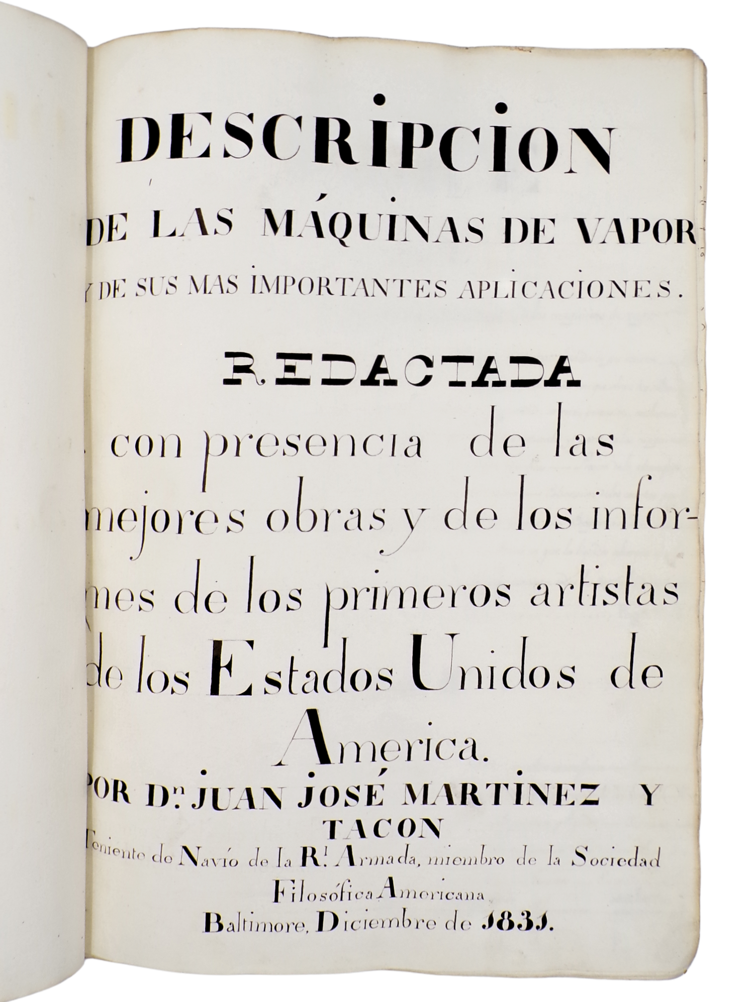 Manuscript draft for the first Spanish technical treatise on the steam engine, authored by the founder of the modern Spanish Navy. Written in Baltimore, this impressive folio in-depth report on the latest advancements in steam engineering in the United States is illustrated with three original detailed technological drawings in ink and nine engraved plates from another publication. This work represents an early introduction of steam engineering to Spain, as the first Spanish steam-powered factory was only opened in 1832, while in the United States, this technology was already much more advanced.