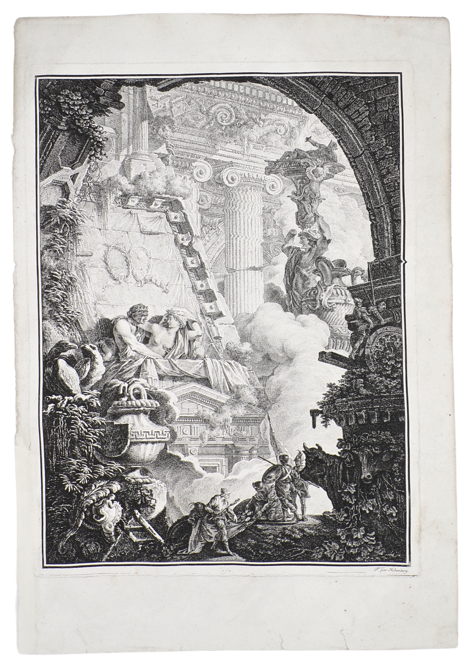 Excellent impressions with wide margins of the proofs before letters for an extremely rare pair of etched architectural fantasies by Austrian architect Johann Ferdinand Hetzendorf von Hohenberg. These are two of only three known etchings by Hetzendorf himself, grouped in his monograph by Erwin Hainisch under the title Drei Phantasien über antike Ruinen. The two architectural fantasies presented here were conceived as a pair, while the third, in oblong format, stands alone within the trio. The third etching appeared on the market several years ago (Teeuwisse) and was described as “extremely rare.” Indeed, the pair we present here does not appear to be held in major collections such as the Albertina, the Akademie der bildenden Künste Wien, the Metropolitan Museum of Art, or the Rijksmuseum. Apart from the three prints by Hetzendorf himself, some prints after Hetzendorf’s designs were executed by Carl Schülz.