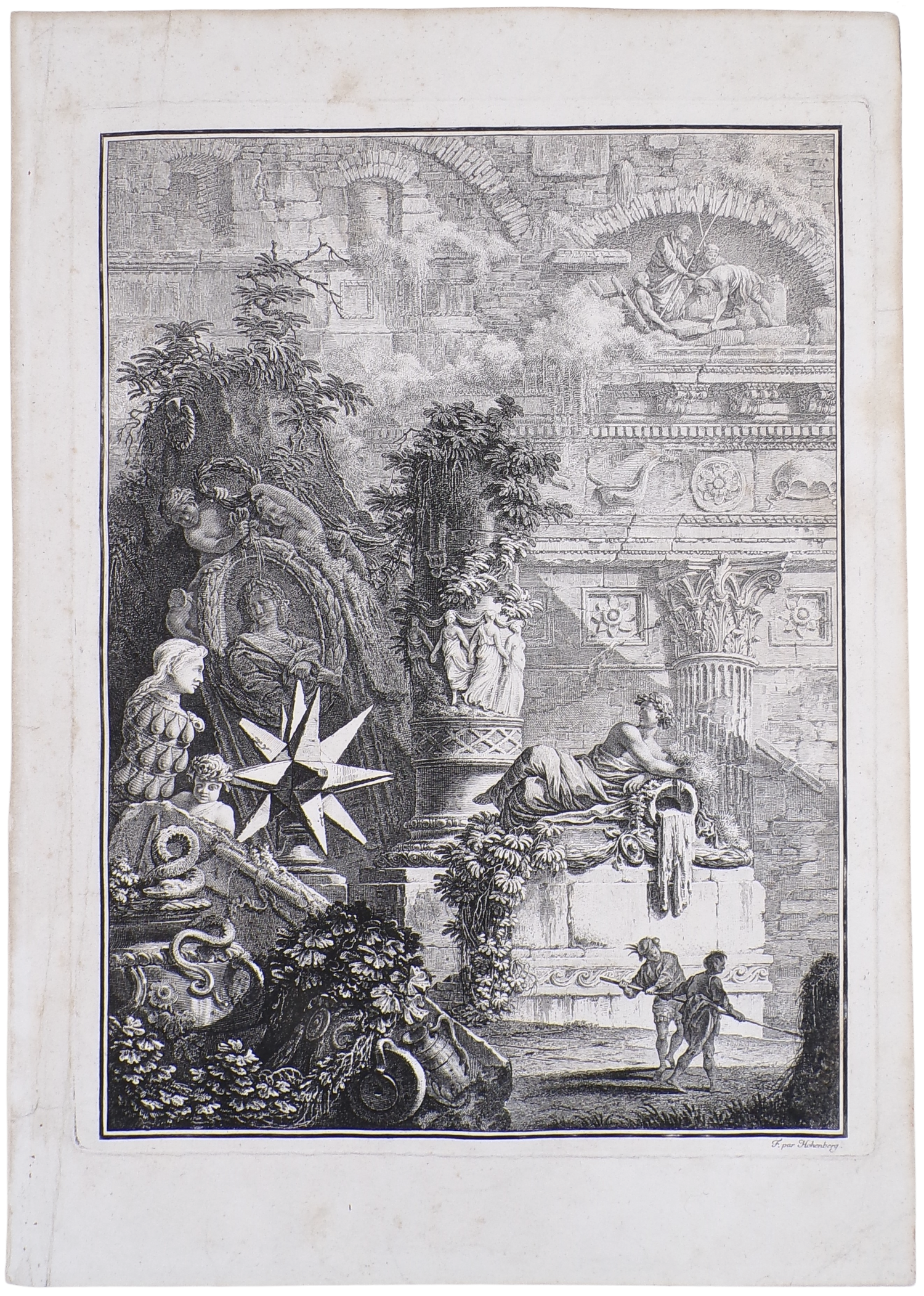 The final states of both prints, with their inscriptions, were reproduced in the monograph but unfortunately without details regarding their whereabouts, and we have not yet traced them. These final states include their titles and Hetzendorf’s dedications to the chief Vienna court architect, Baron von Paccassi. According to Hainisch, "the works were created purely as fantasies, without any specific literary foundation." When Wilhelm Beyer published all three plates in his Neue Muse in 1784, he referred to them as "determinative pieces" and recommended them as models: for painters, to adorn the wall at the end of an alley or depict ruined temples; for sculptors, as inspiration for fragmented works. However, it is also noted that the artist created these compositions without a specific purpose in mind.