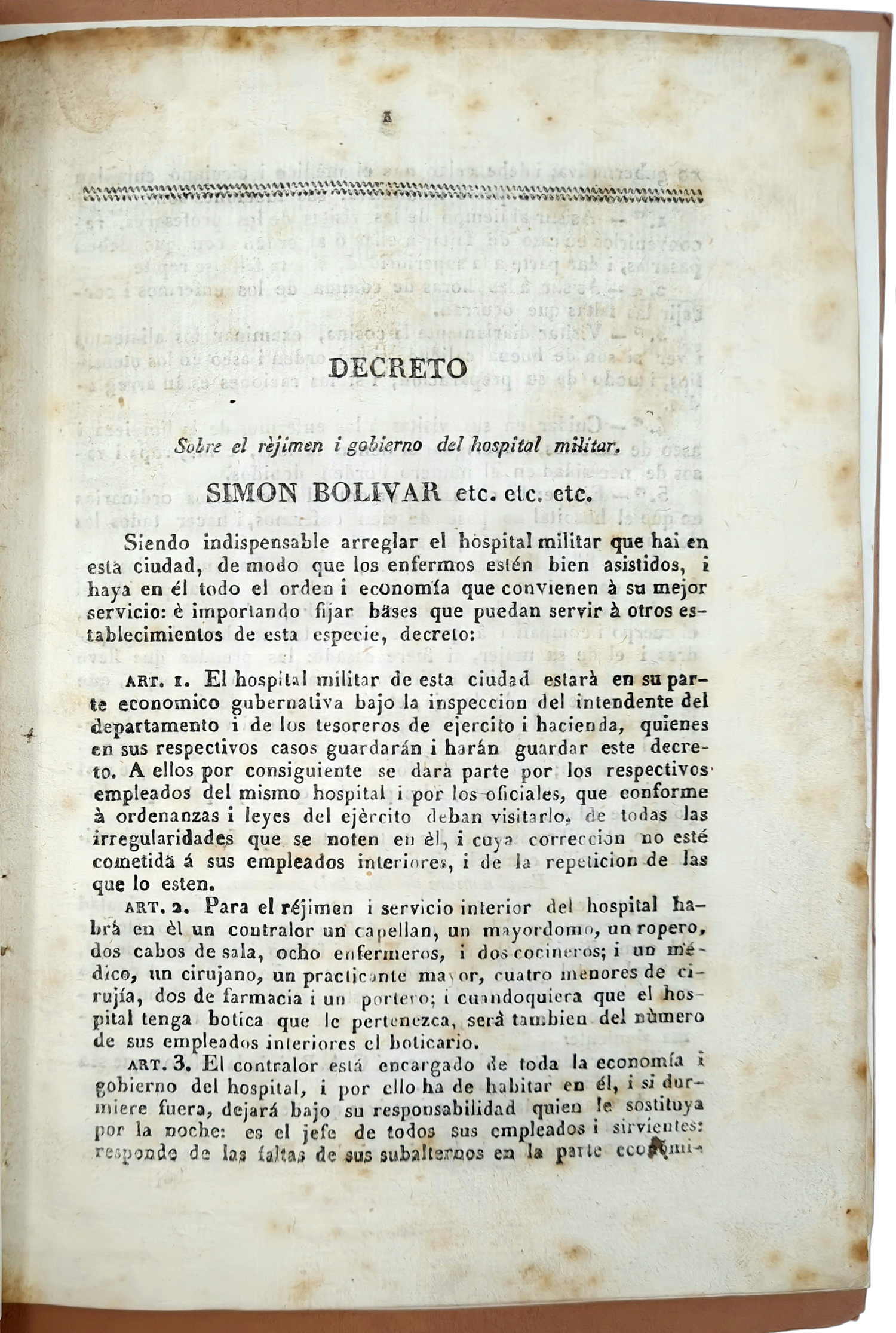 Decreto sobre el rèjimen i gobierno del hospital militar.