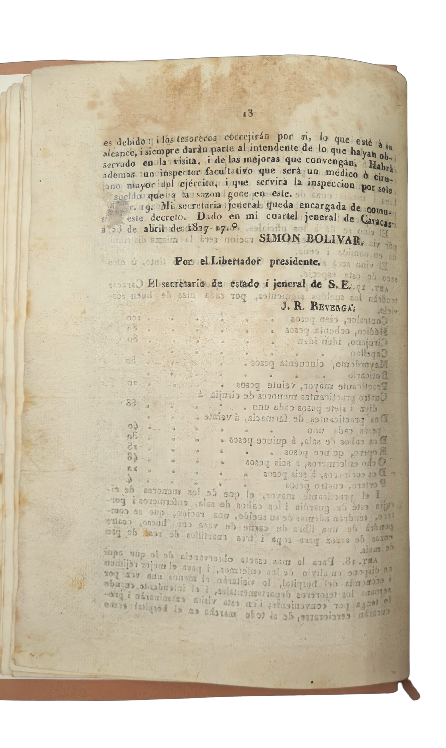 Decree by Bolivar to improve the military hospital at Caracas, Venezuela and the medical infrastructure in general. Issued by his Secretary General José Rafael Revenga, this lists 19 articles to which the hospital and all other medical establishments should adhere to. The final pages states that this decree was “Given at my headquarters in Caracas on April 23, 1827-17°”. Medical services had been largely the responsibility of religious organisations. Bolivar aimed to strip monastic orders of their influence and the present decree can be seen as an example of that development.