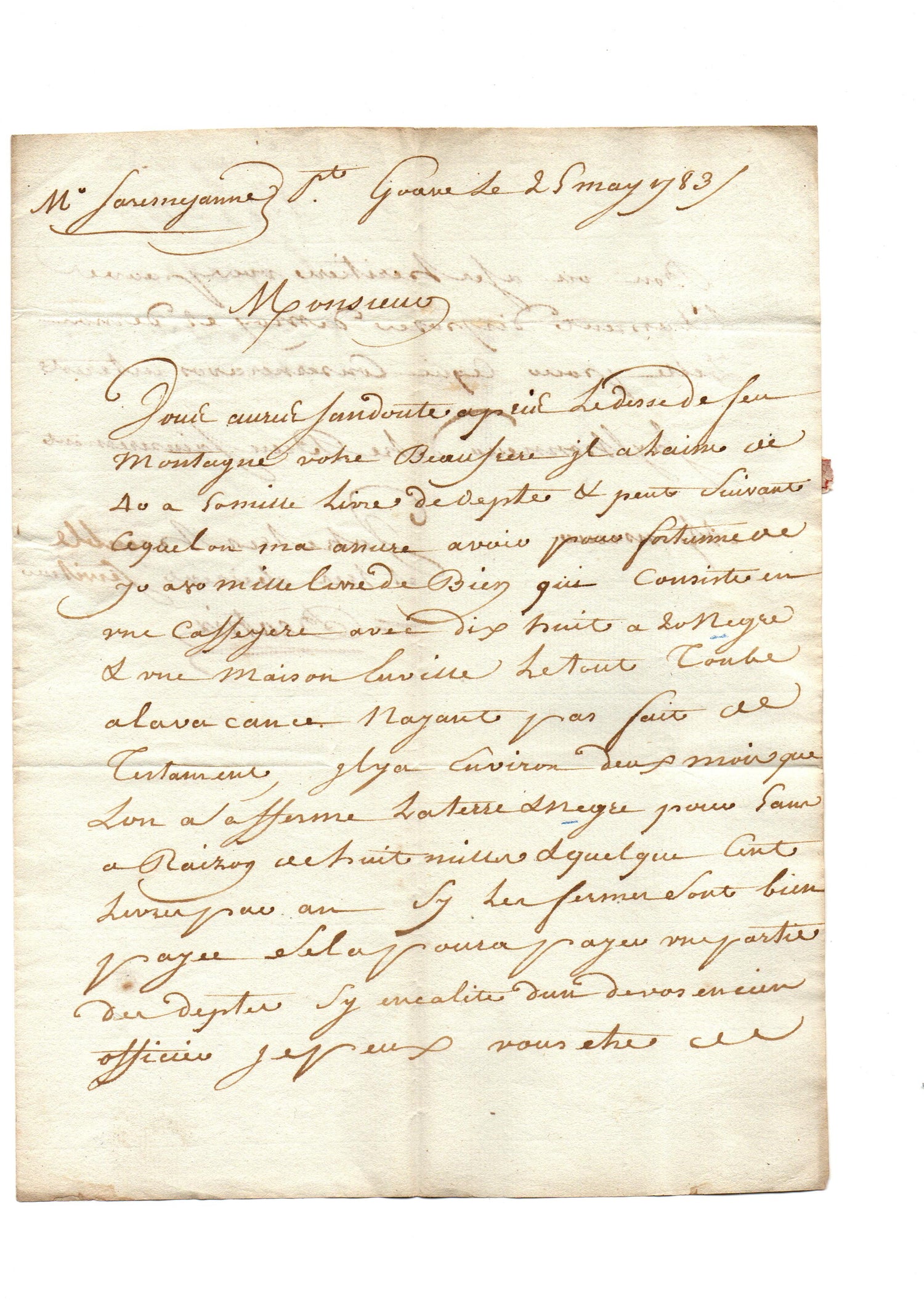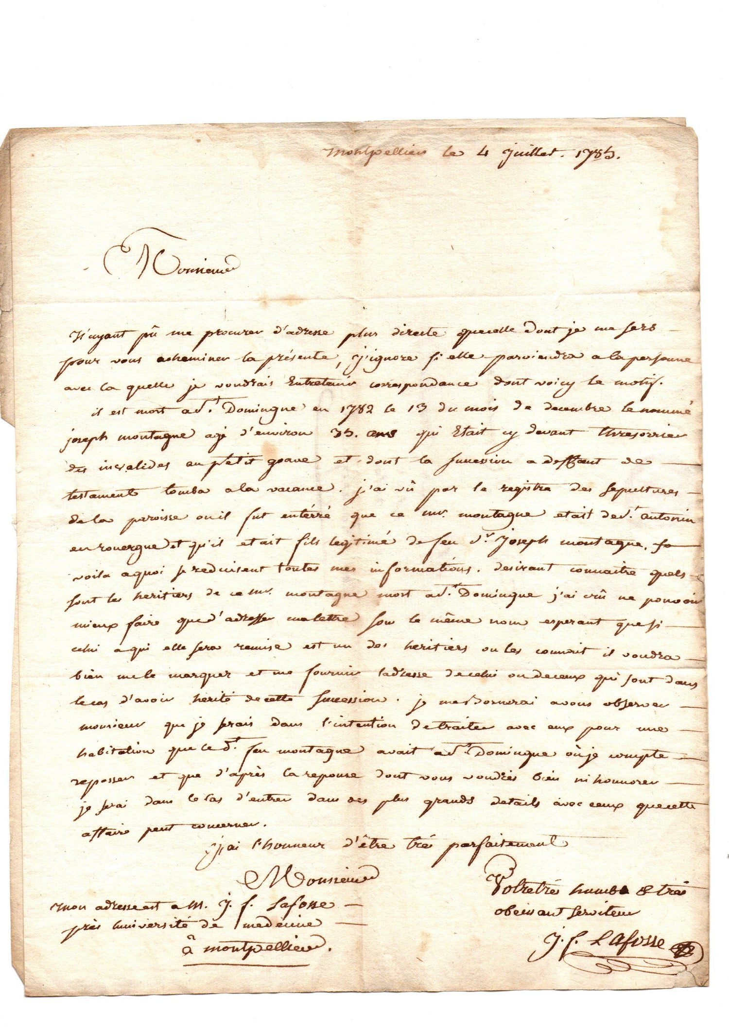 A coherent documentary group tracing the metropolitan aftermath of a colonial death in Saint-Domingue and the transmission of plantation property to France in the decade preceding the Haitian Revolution. The earliest letter, written from Petit-Goâve in 1783, announces the death of Joseph Montagne, formerly trésorier des invalides, and values his estate at 70–80,000 livres, consisting of “une caféière avec 18 à 20 nègres et une maison en ville.” Later letters from Bordeaux and Montpellier, addressed to a ship’s captain at Saint-Antonin (Rouergue), pursue the identification of Montagne’s heirs after an intestate death and explicitly propose negotiating for the purchase of his “habitation” in Saint-Domingue. Together they offer rare, concrete evidence of how colonial estates — including enslaved people — were administered, inherited, and marketed in provincial France.