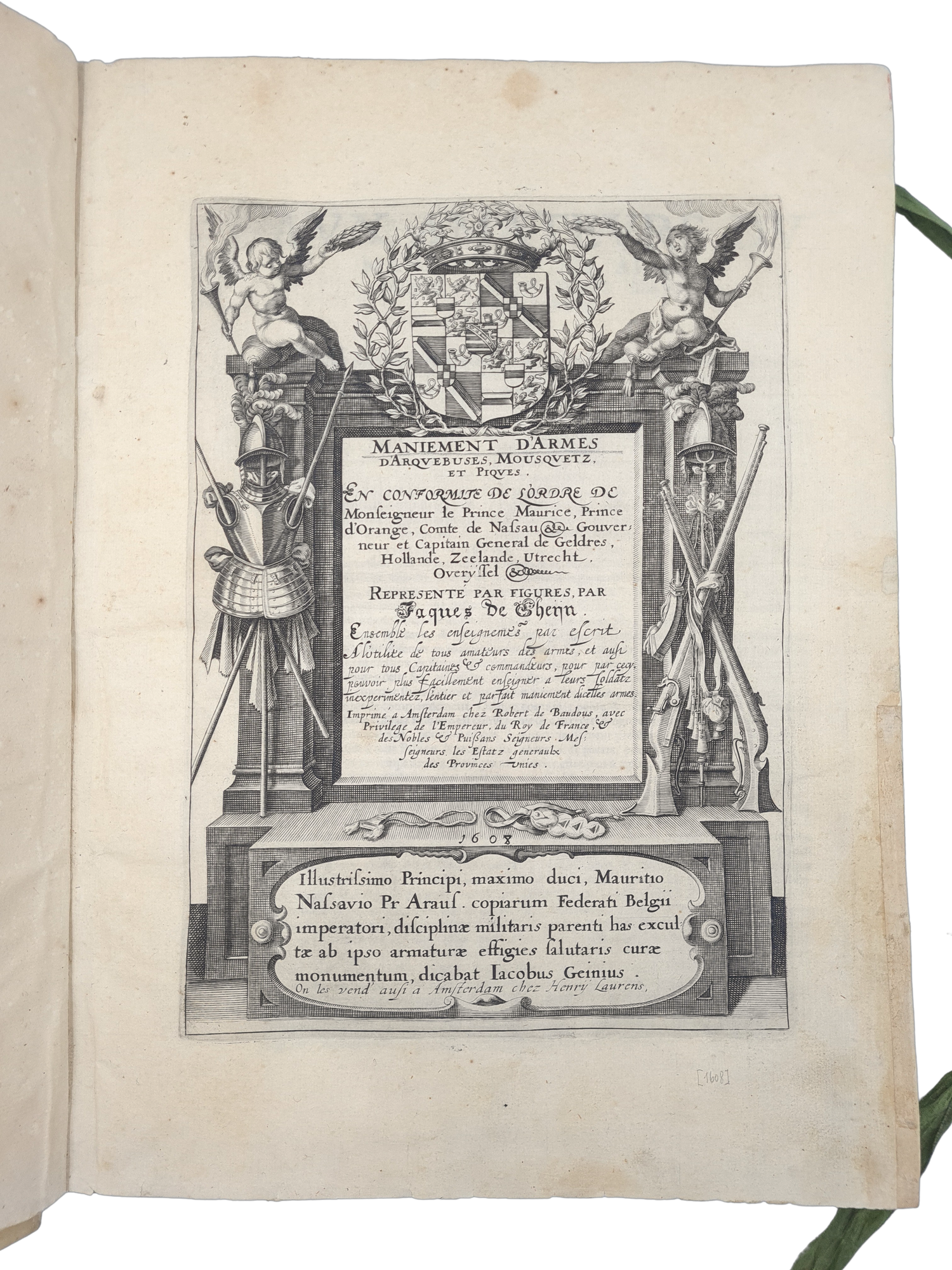 En conformité de l’ordre de Monseigneur le Prince Maurice, Prince d’Orange, Comte de Nassau etc. Gouverneur et Capitain General de Geldres, Hollande, Zeelande, Utrecht, Overijssel etc. Representé par figures, par Jaques de Gheijn. Ensemble les enseignemens par escrit, a l'utilite de tous amateurs des armes, et ausi pour tous capitaines & commandeurs, pour par cecy, pouvoir plus facillement enseigner a leurs soldatz inexperimentez, l'entier et parfait maniement dicelles armes […].