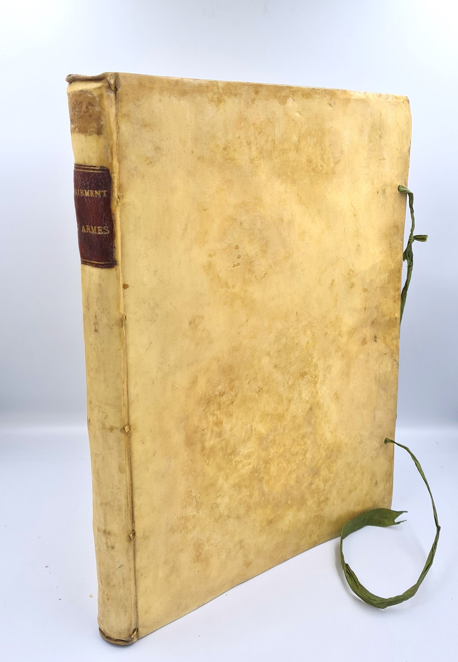 Complete copy of De Gheyn’s beautiful folio pictorial arms manual, with the 117 plates in remarkably good impressions with deep contrast and deliberate even plate tone, giving them a drawing-like appearance. This copy is the rare first issue of the first edition in French, which can be discerned by the name of the seller Henrij Laurens at the foot of the title and the signature of De Gheyn in the first plate of all three parts. This issue was to be sold in Amsterdam while two later issues were sold elsewhere and thus lack the seller’s name. The manual was first published in Dutch, with the same number of plates, as Wapenhandelinghe van roers, musqvetten ende spiessen (Amsterdam, 1607).