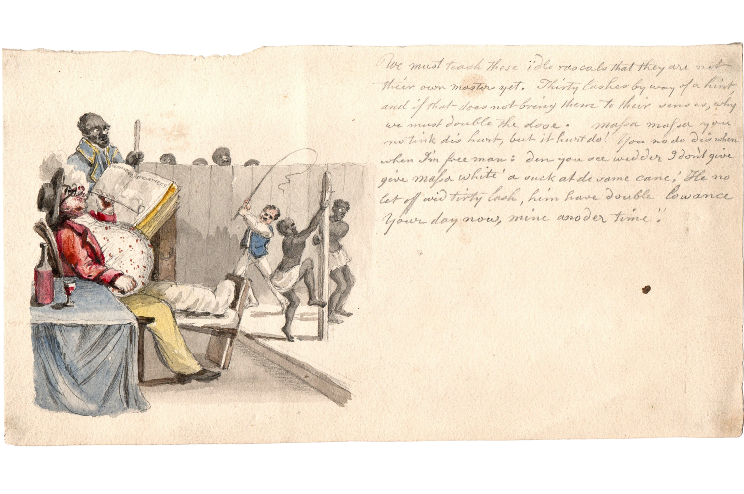 This striking watercolour depicts a plantation scene in which a seated slave owner idly supervises the flogging of an enslaved man. The master, a big-bellied white man in a red coat and yellow breeches, lounges beside a bottle and glass of wine, while an enslaved Black servant reads aloud from a large open volume titled Law. In the background, a white overseer administers lashes to a bound Black figure as other enslaved Black people look on from behind a fence.