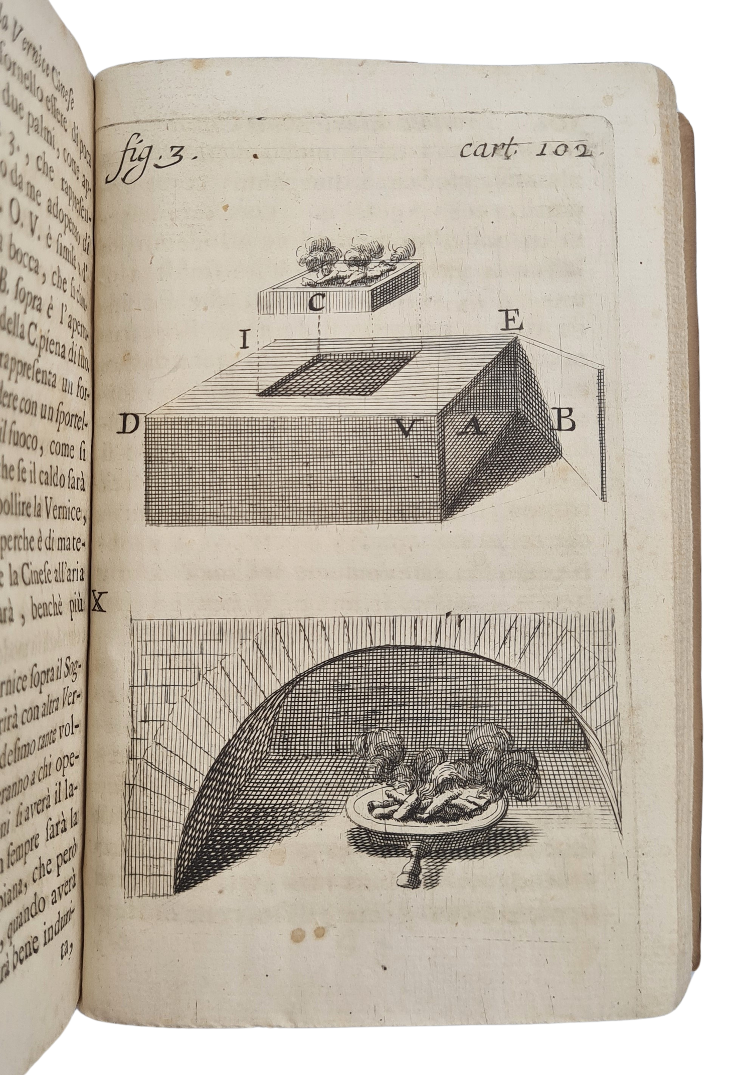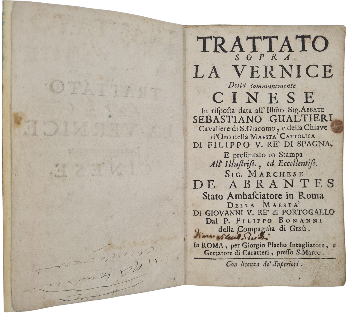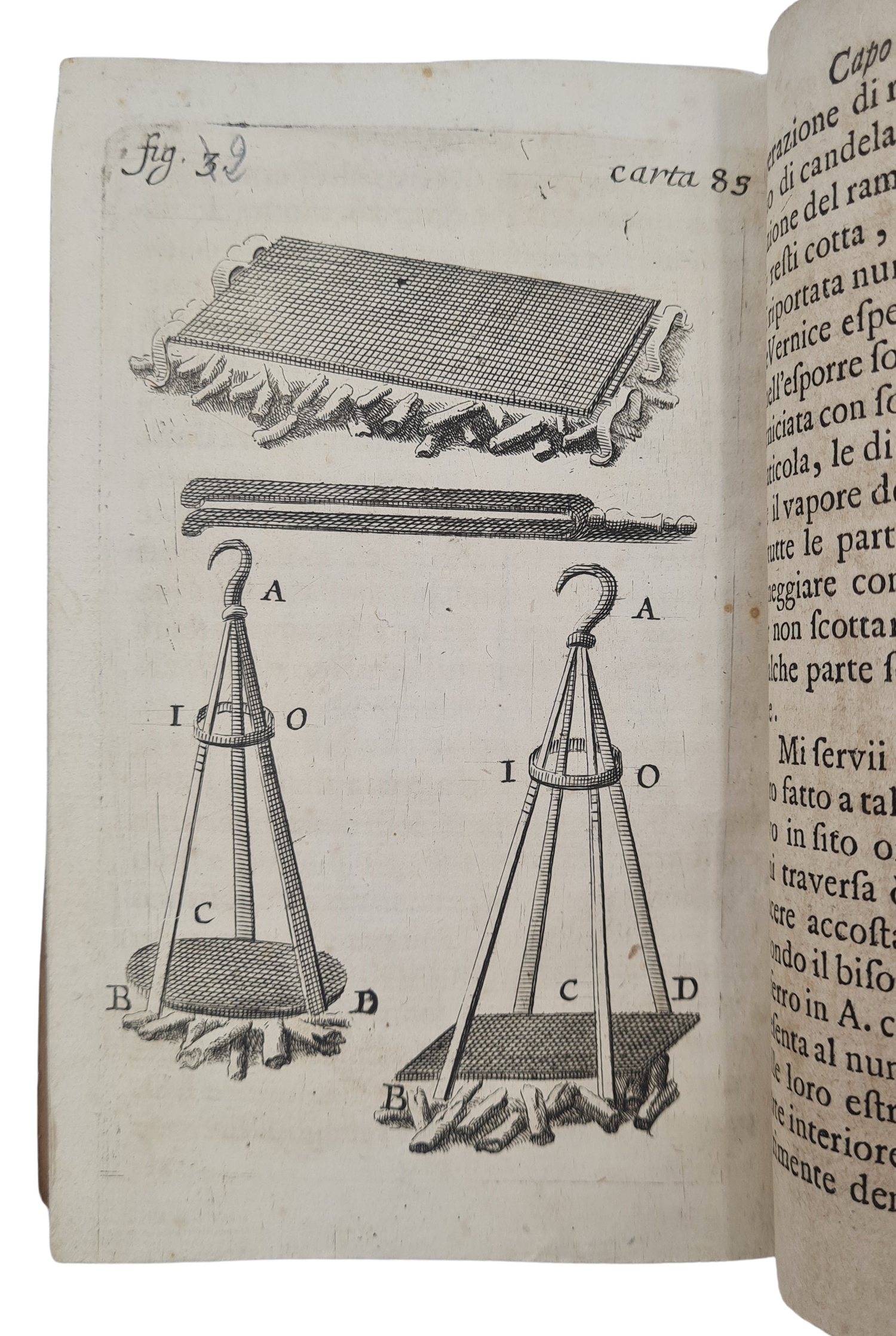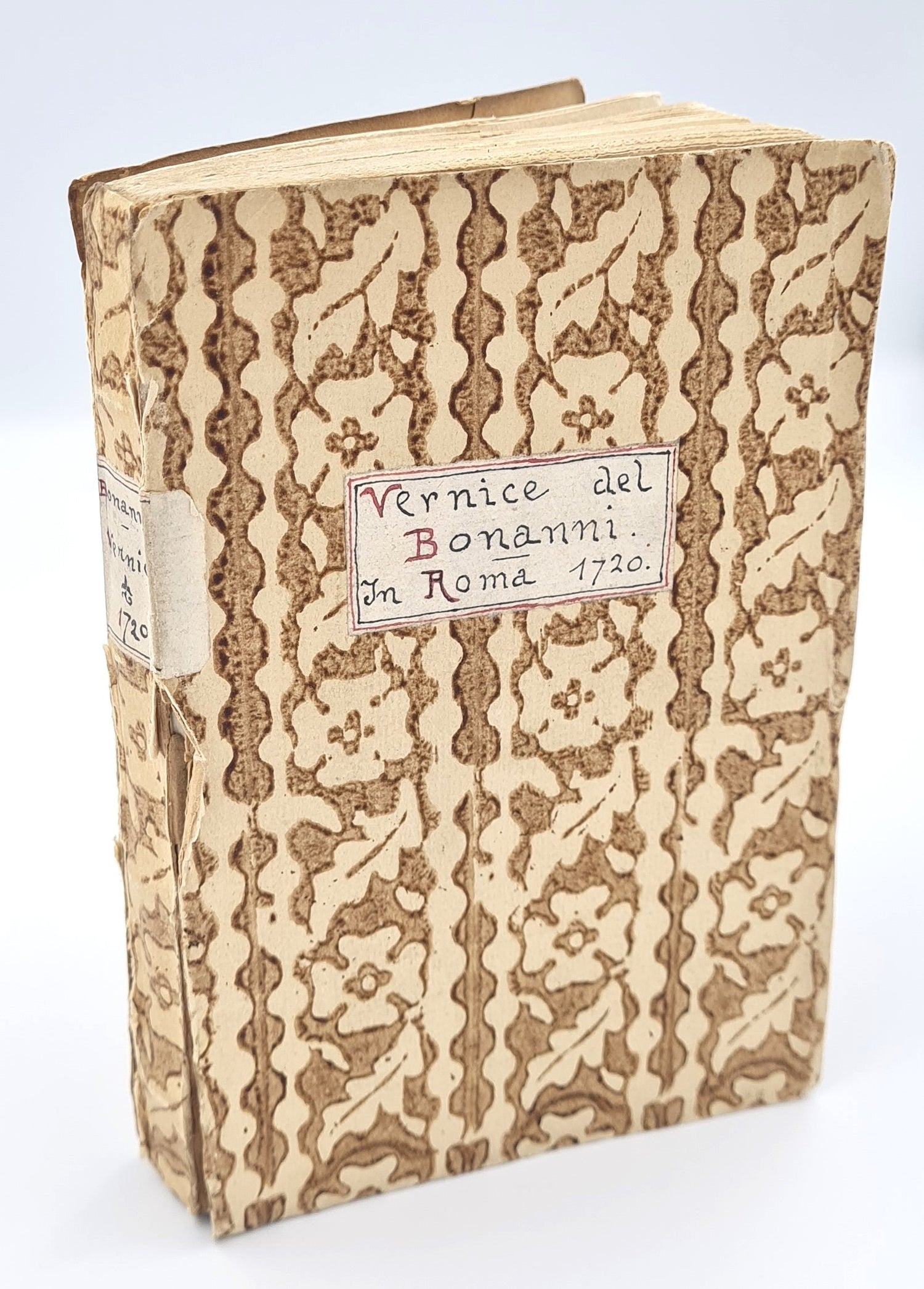 Rare first edition of the first European treatise on Chinese and Japanese lacquer and varnishing, introducing the application and ingredients necessary for its preparation. The plates illustrate the tools needed in the various steps of making the recipe and how they are used. In a combination of information from Asia and his own findings, the author provides many recipes for paint, transparent and coloured varnishes, and colours. Author Filippo Bonanni (1638-1725) was a student of Athanasius Kircher at the Jesuit College at Rome and became a professor of mathematics there. The Jesuits were an important getaway of Asian culture into the West, as is evidenced by the lacquer manual that we offer here. The book quickly became popular, prompting editions to be published throughout Europe: a French translation in 1723 (Paris: Laurent d'Houry), Dutch in 1742 (Leiden, J. Willeke) and German in 1746. Later editions continued to appear throughout the century and beyond.
