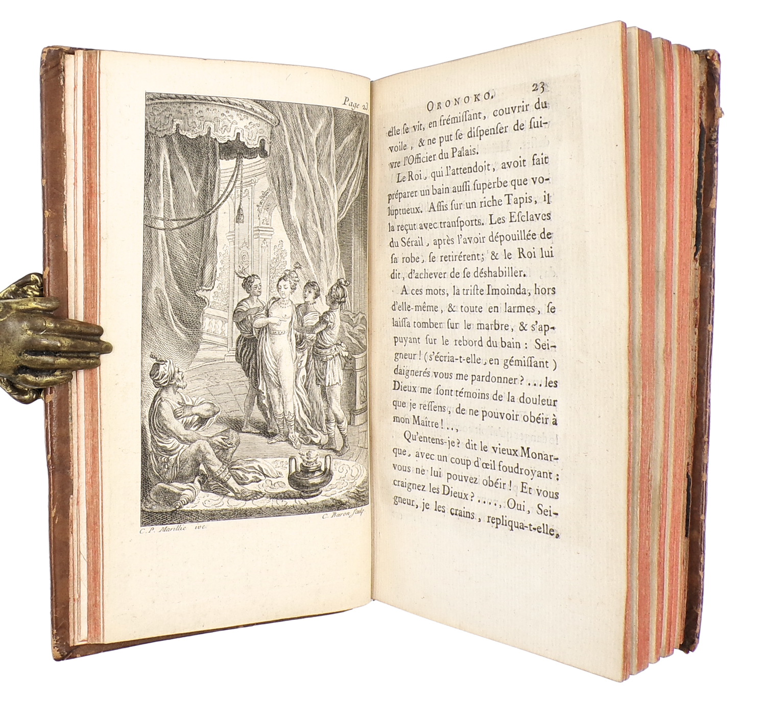 First illustrated edition of the French adaptation by Pierre-Antoine de La Place (1707–1793) of Aphra Behn’s Oroonoko; or, the Royal slave (1688). This pioneering novel is widely recognised as the first Western fiction to portray a Black hero with dignity and moral depth, condemning the barbarity of slavery through the tragic story of an African prince betrayed and sold into servitude in Surinam. Aphra Behn was one of the earliest professional women writers in English literature.