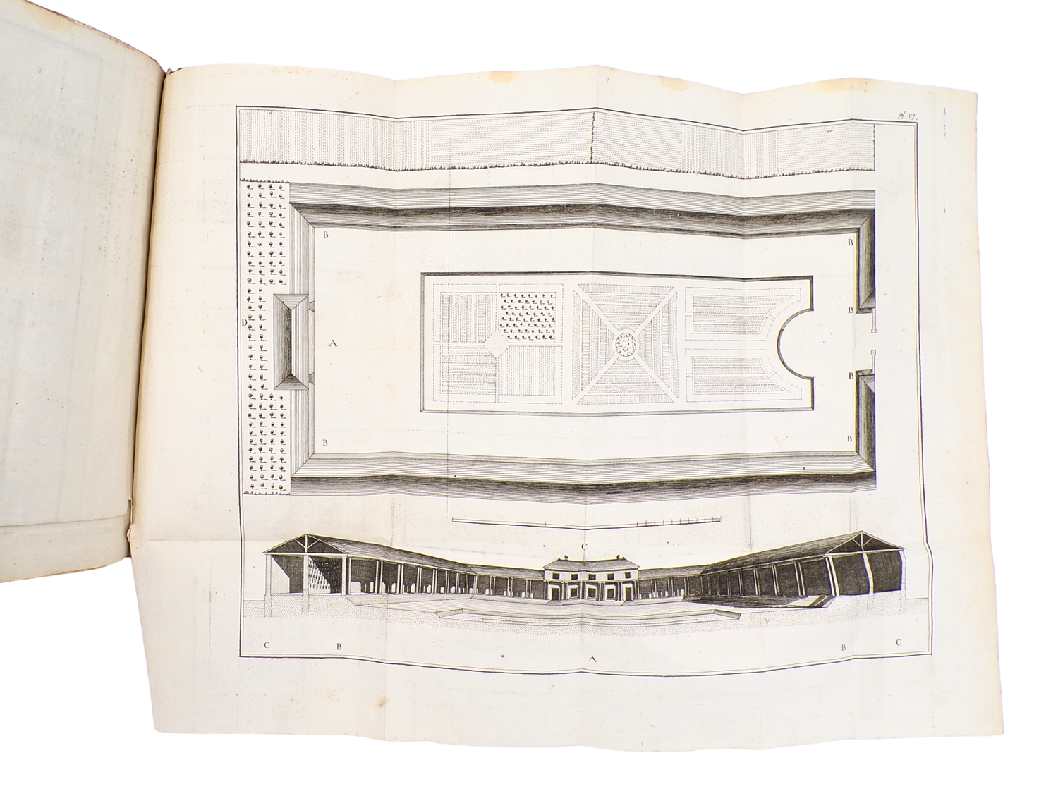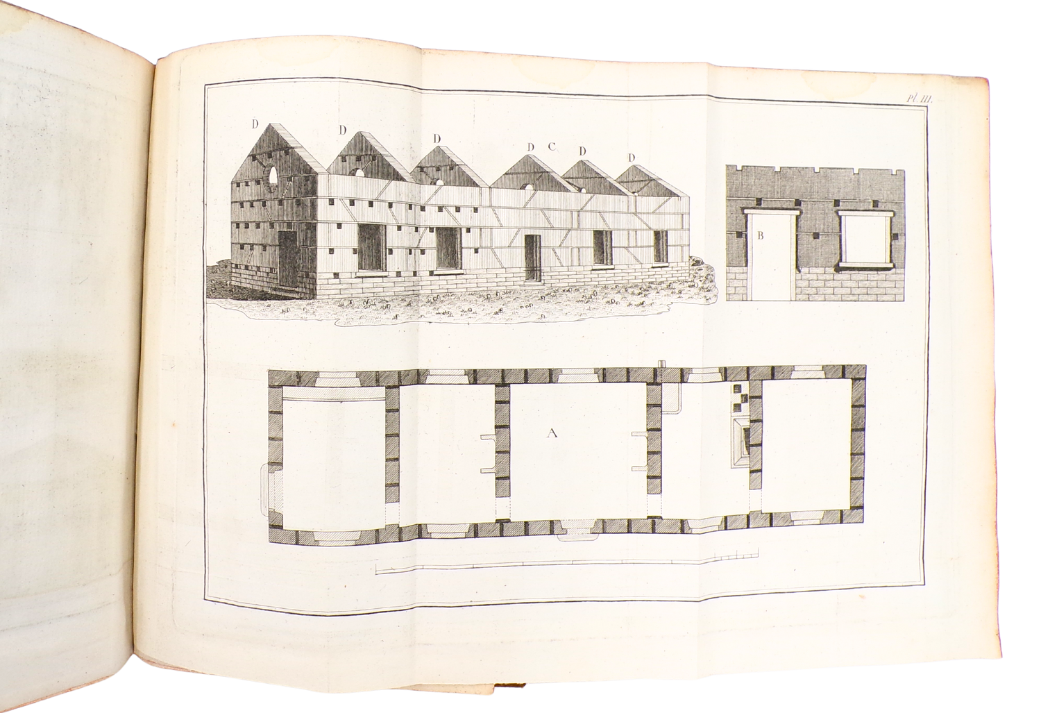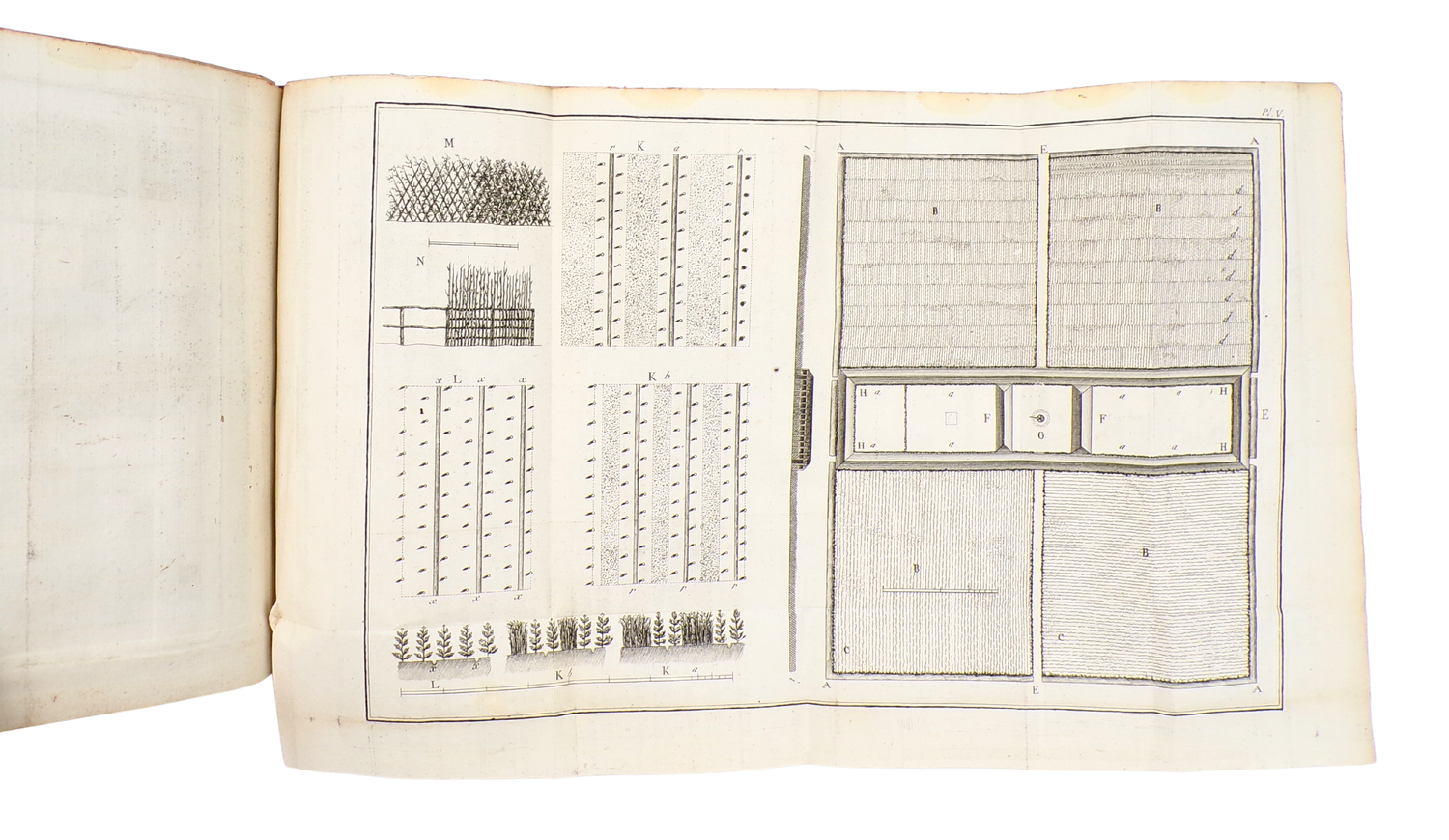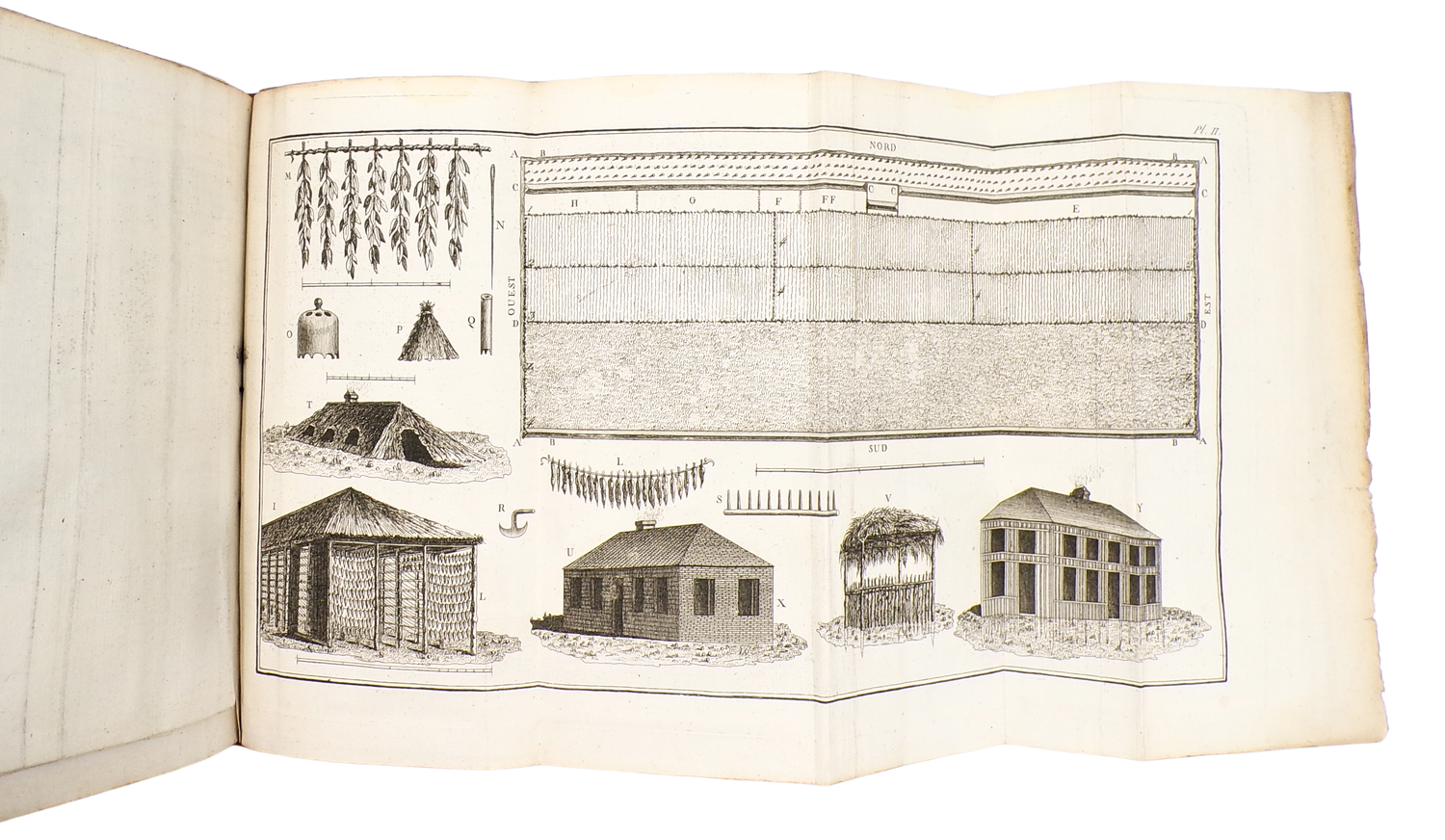 Published in response to the abolition of France’s state tobacco monopoly in 1791, this work provides an exhaustive study of tobacco cultivation across Europe and the Americas. It details every stage of production—from soil preparation and harvesting to processing and sale—offering landowners practical guidance in a newly deregulated market. The six large folding plates illustrate key aspects of plantation work, including drying houses, machinery, and field labor.