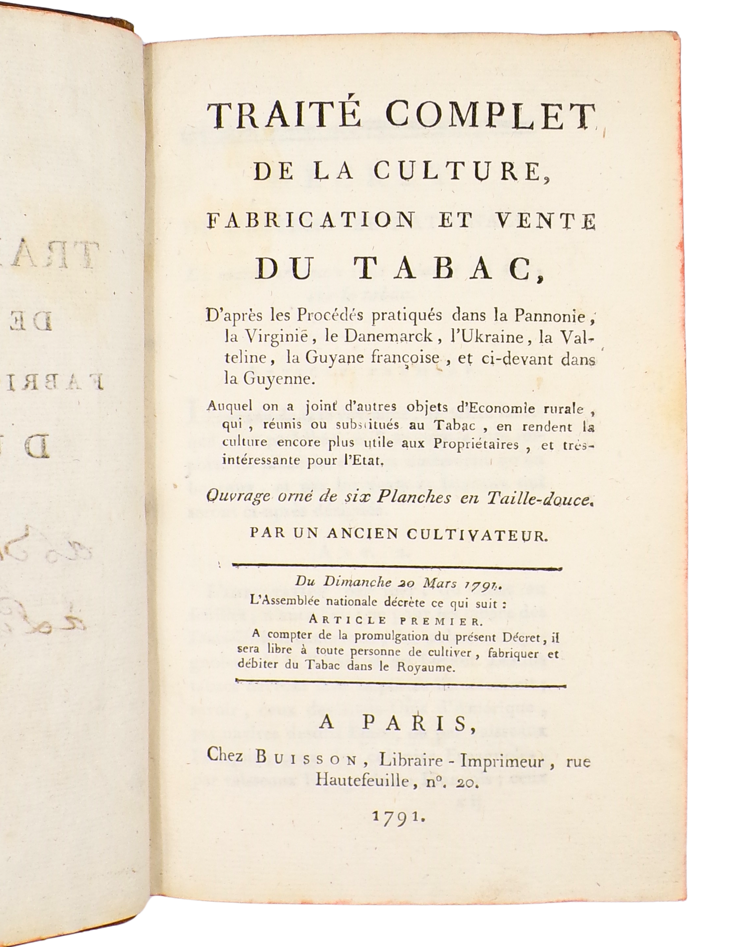Traité complet de la culture, fabrication et vente du tabac, d'après les procédés pratiqués dans la Pannonie, la Virginie, le Danemarck, l'Ukraine, la Valteline, la Guyane françoise, et ci-devant dans la Guyenne. Auquel on a joint d'autres objets d'economie rurale, qui, réunis ou substitués au tabac, en rendent la culture encore plus utile aux propriétaires, et tres intéressante pour l'etat. Ouvrage orné de six planches en taille-douce.