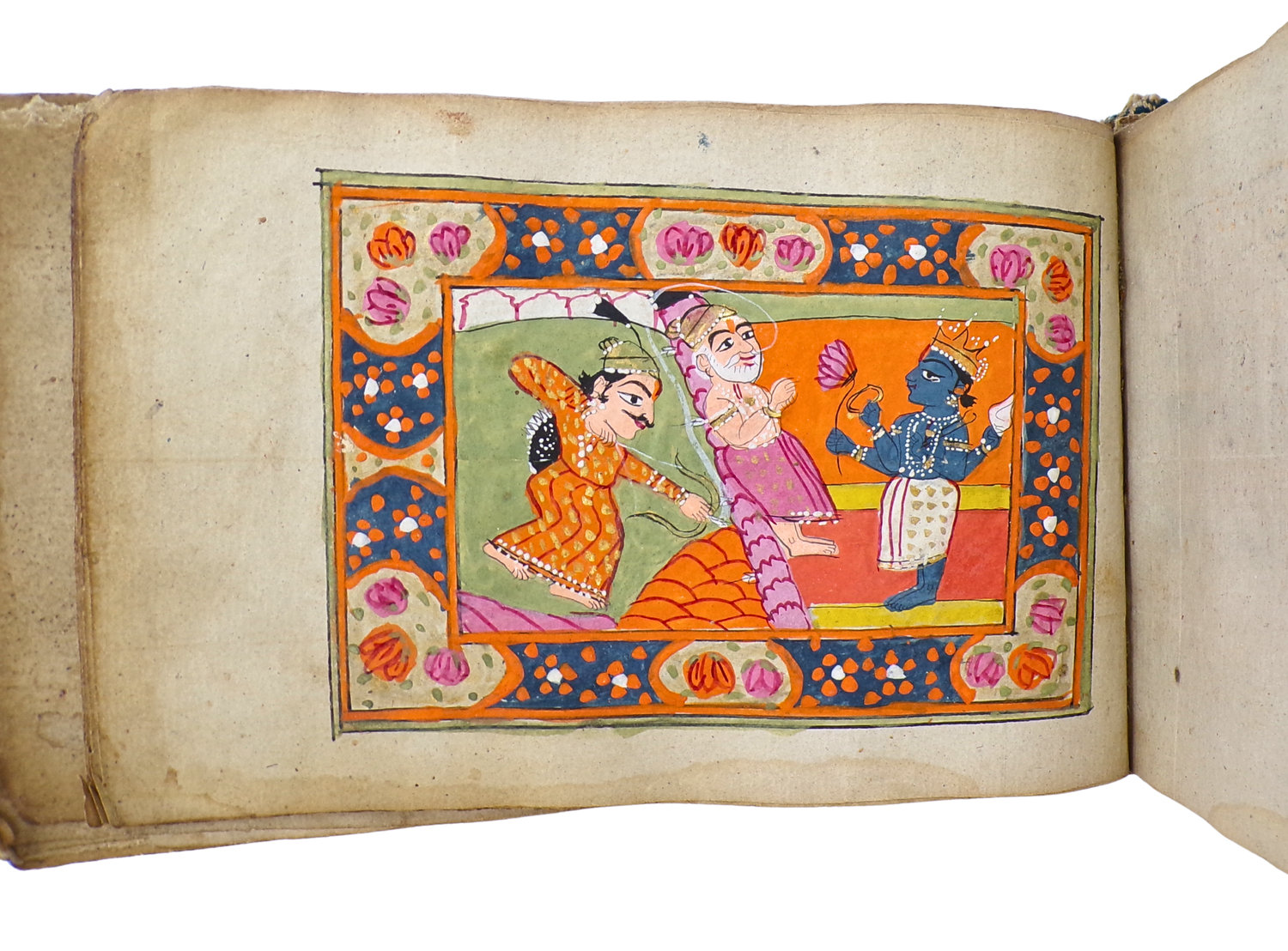 This manuscript is a rare example combining devotional literature, miniature painting, and regional Indian textile craftsmanship. Its high artistic and material quality suggests it was commissioned by a patron of means or produced for temple use.