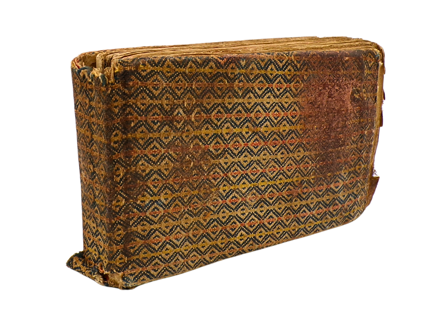 The binding is made of handwoven textile featuring a repeating diamond motif in red, blue, ochre, and black. The fabric is likely of regional origin, perhaps from Gujarat or Rajasthan, and may be associated with traditional khes or mashru weaving techniques.