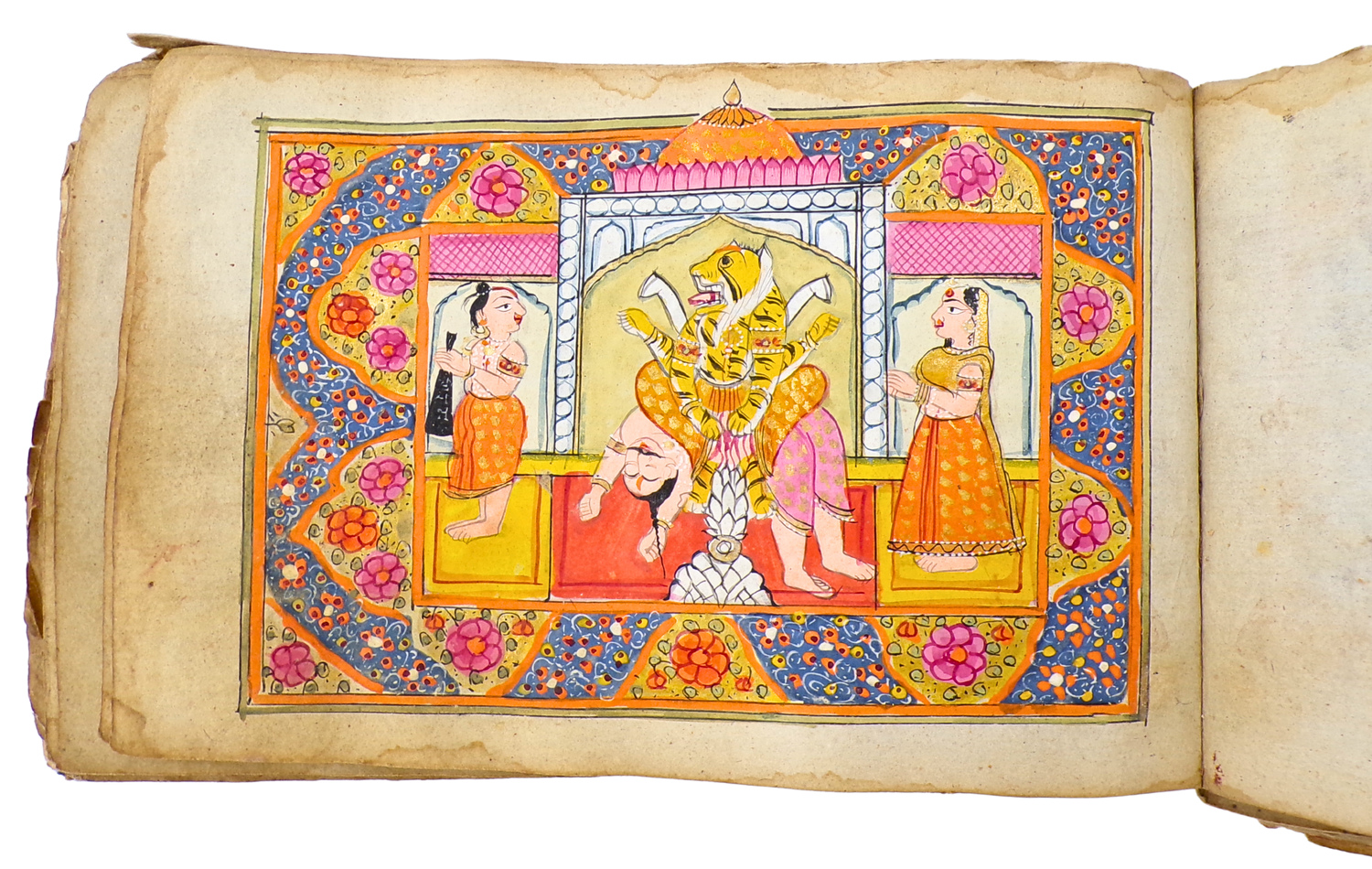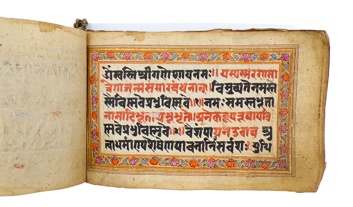 Oblong (9,5 x 16 cm.). 465 pp. text in Sanskrit using the Devanagari script and 10 drawings in bright colours and gold on paper. Coloured borders around the text, some more lavishly with gold and floral motifs.