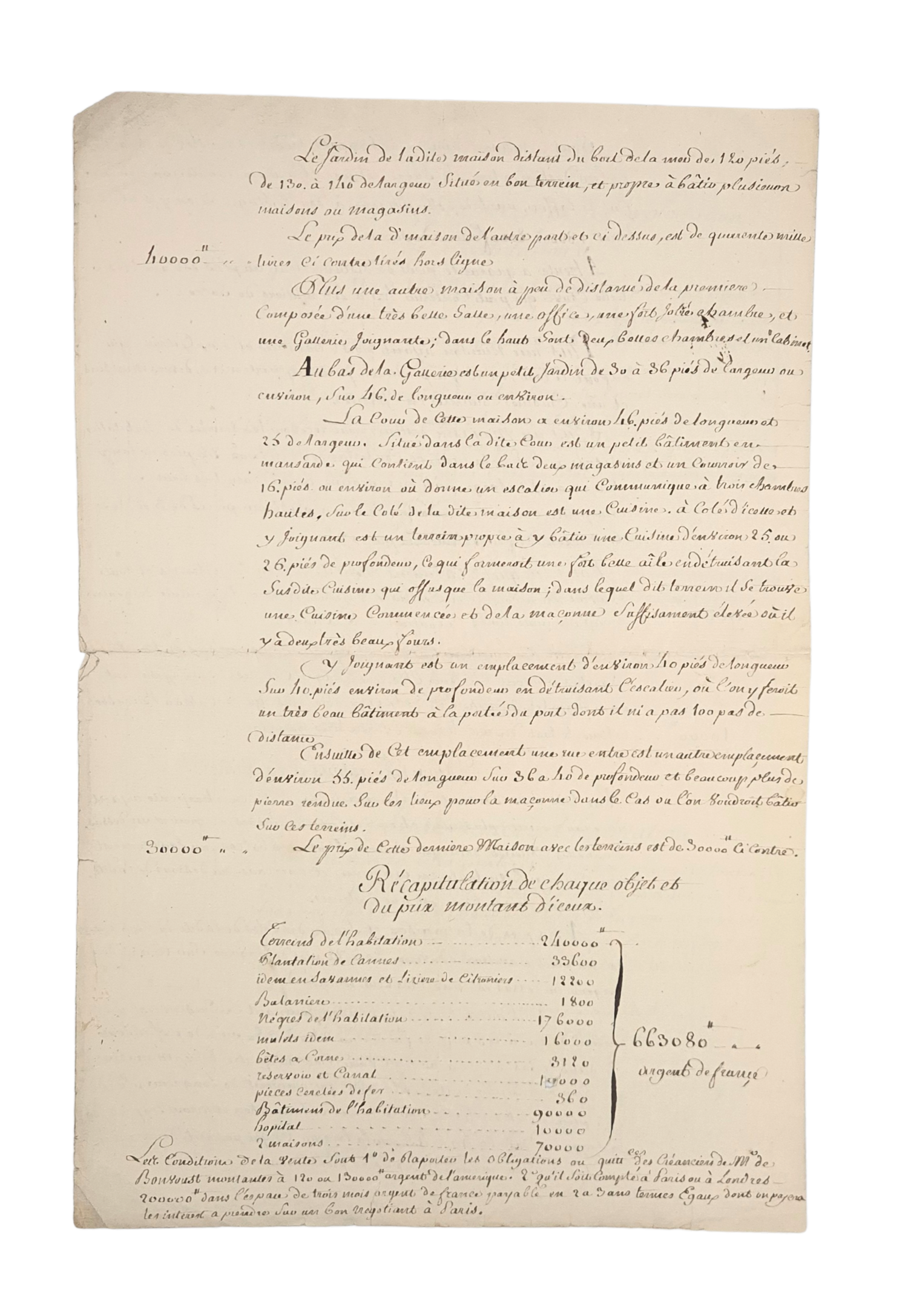 The manuscripts also include a final recapitulation summarizing the value of each component of the estate: land, plantations, savannas, buildings, sugar works, enslaved people, livestock, canals, iron fittings, hospital, and town houses. The total valuation amounts to 663,080 livres, underscoring the exceptional scale and wealth of the Baron de Bonvoust’s Grenadian holdings.