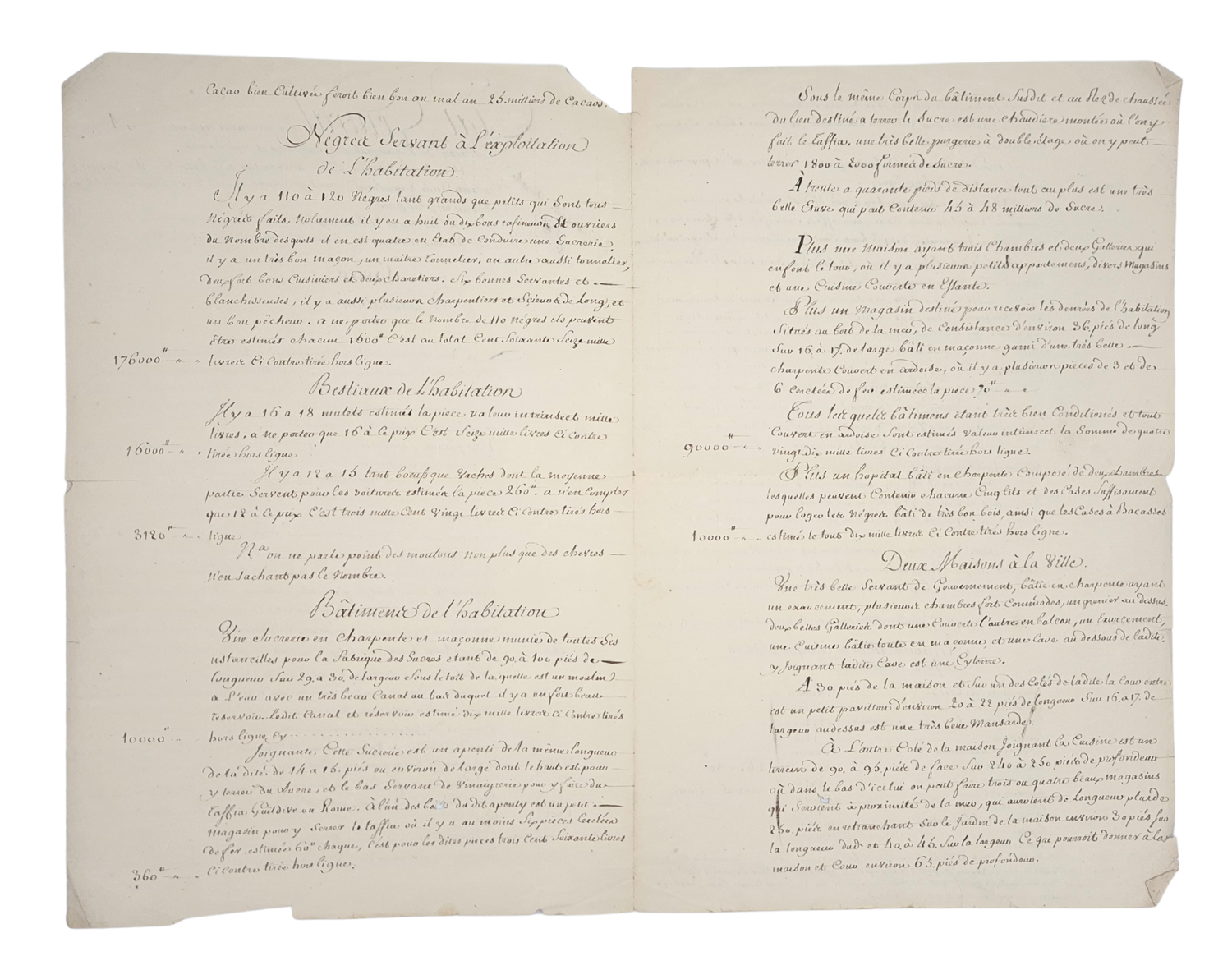 Important set of two manuscripts recording the plantation, urban properties, enslaved labor force, buildings, livestock, and industrial installations of Pierre Claude, Baron de Bonvoust, Governor of Grenada.