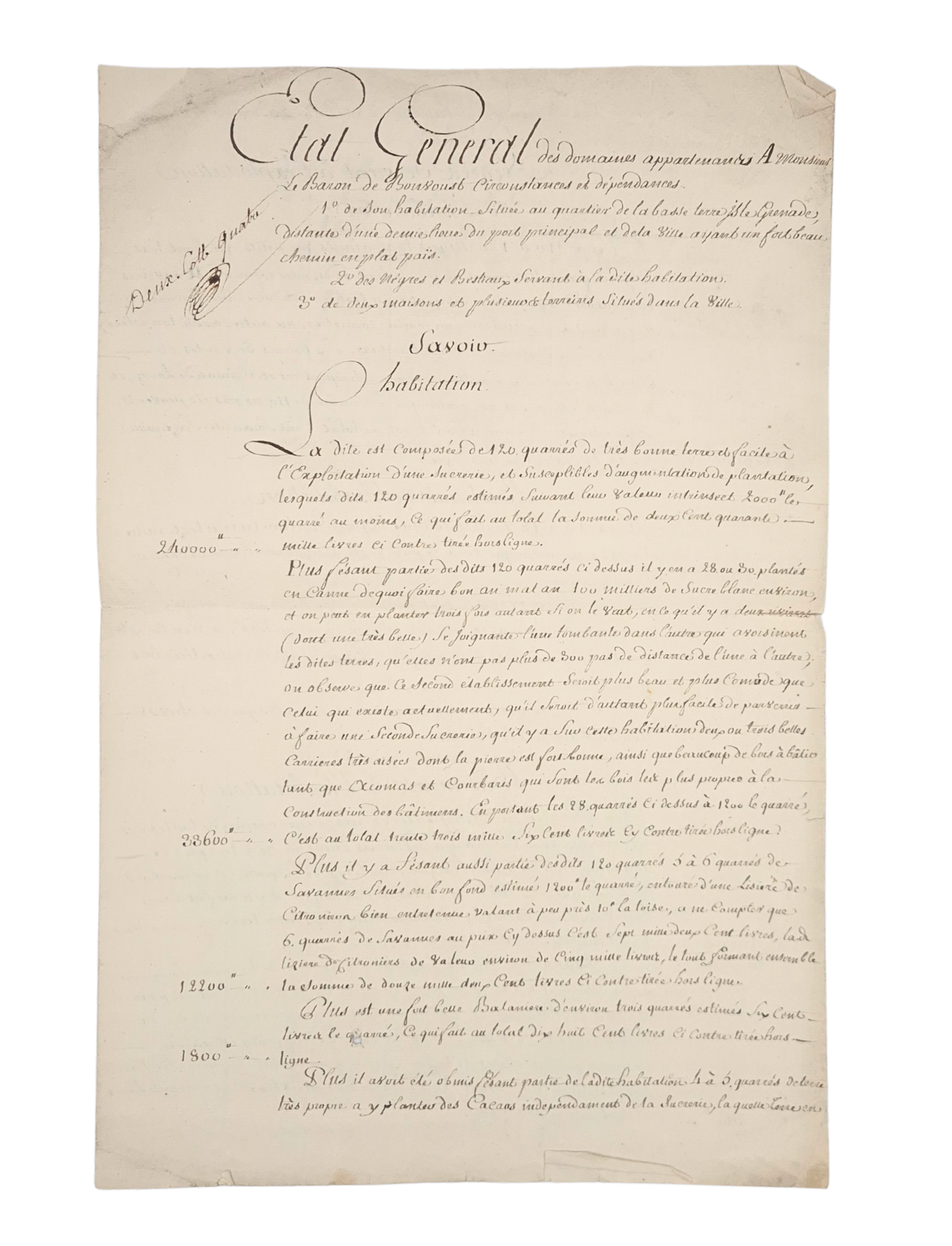 A long and precise description follows of the habitation, comprising approximately 120 carrés of land of very good quality, including extensive cane fields, savannas, and provision grounds. Portions of the land are planted in sugar cane already in production, with further areas suitable for expansion. The valuation of the land alone is carefully calculated, parcel by parcel.