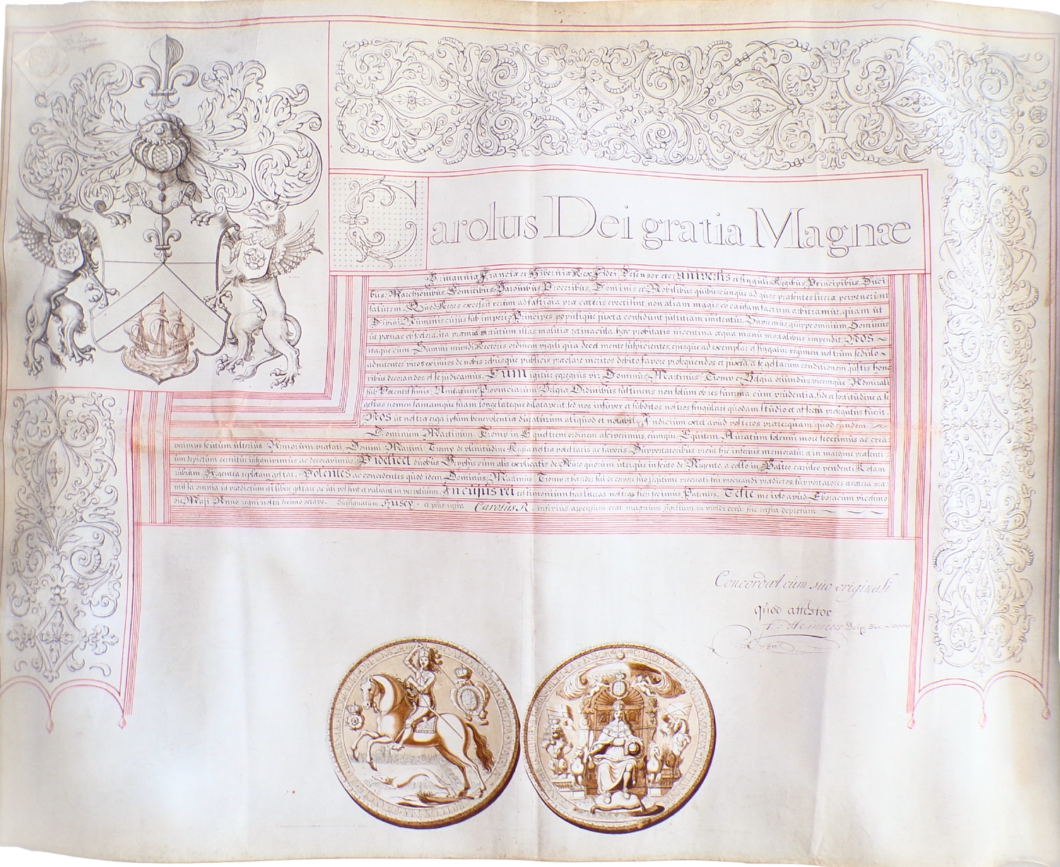 Calligraphic Latin in ink on vellum (62.9 cm x 62.9 cm), with rubricated lines, with the arms of Tromp in canton, with rinceaux banding. With the ink seal of Charles I in base. Signed "A. Heinsius 16-8/17-75".