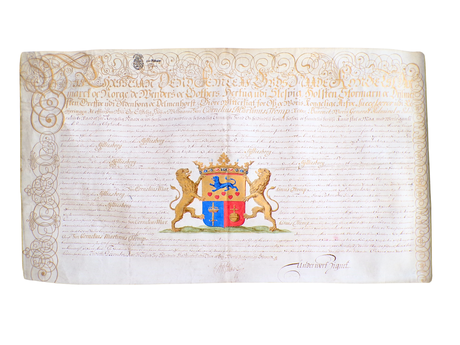 Calligraphic Danish in gilt and ink on vellum (44.5 cm x 79.4 cm), with gilt ornamental marginal decorations, the coat of arms of the Count of Sylliesborg hand-drawn in colour in the center, and the signature of Christian V of Denmark. No seal present.