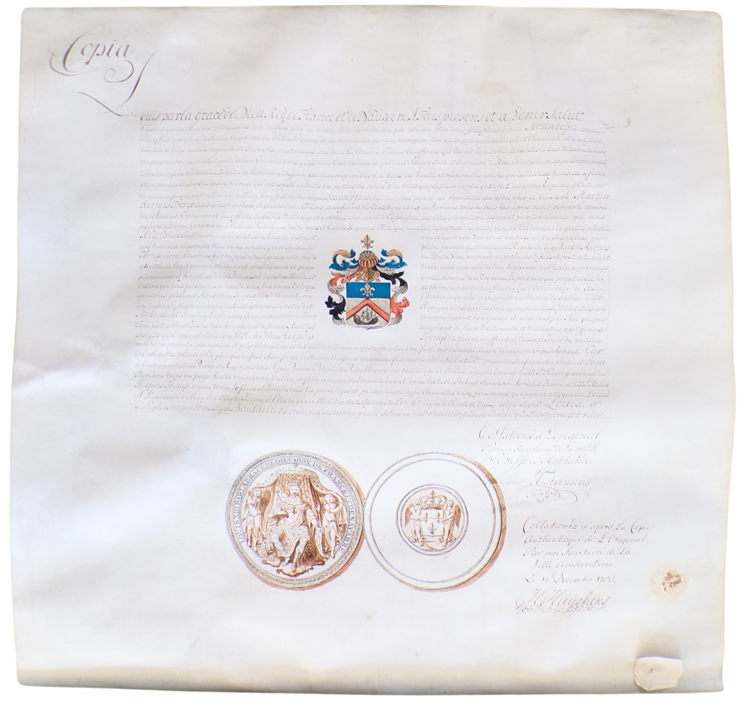 Calligraphic French in ink on vellum (69.2 cm x 88.9 cm), with the arms of Maarten Tromp drawn and coloured by hand in ink and gouache; with the seal of Louis XIII drawn by hand in ink; signed by hand in ink by Anthonie Heinsius in Delft "A. Heinsius 16-8/17-75"; signed by hand in ink by Hendrik Huijghens (1755-1838), Secretary of the city of Amsterdam, dated "VI December 1788", “copia” written in ink in the top left.