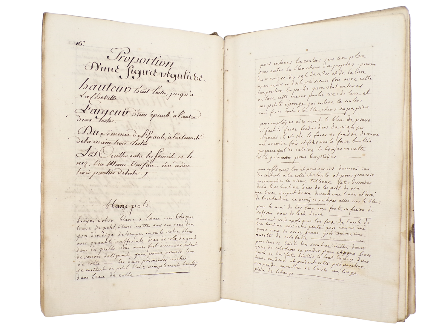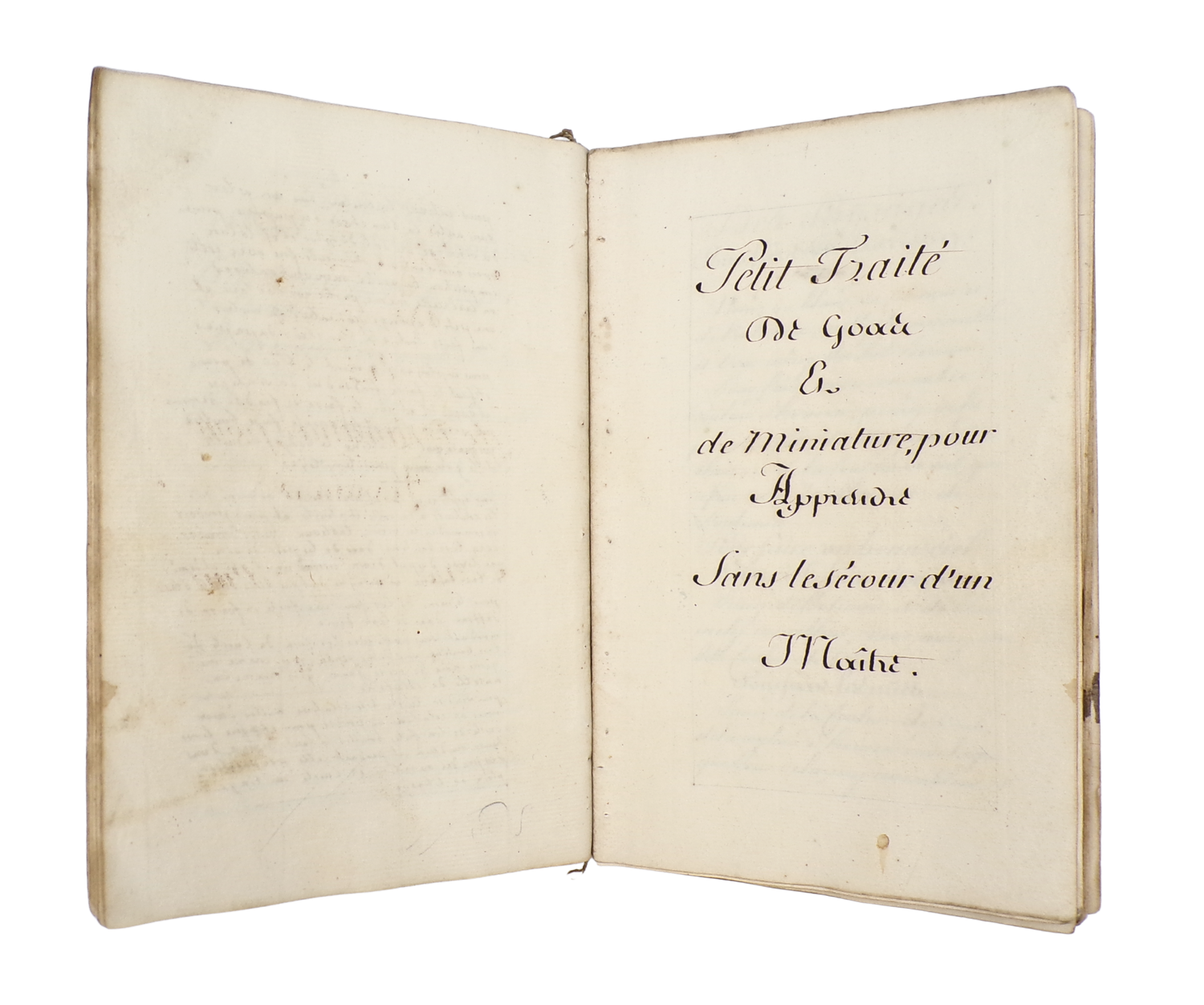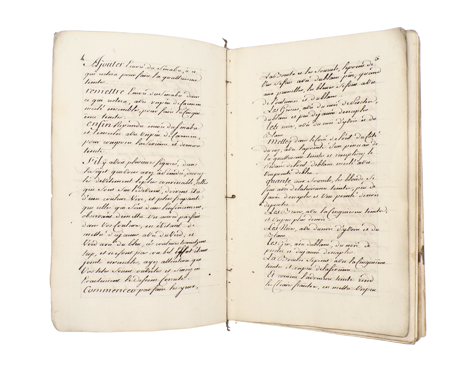 A carefully written manuscript painting manual, it combines material drawn from printed authorities with the compiler’s own observations. It comprises two parts: the first, a concise recueil of colour shades for glass painting, the second a more extensive instructional treatise on miniature painting. The handwriting is consistent throughout, except at the close of the first part, where a second hand continues with the section headed blanc poli.