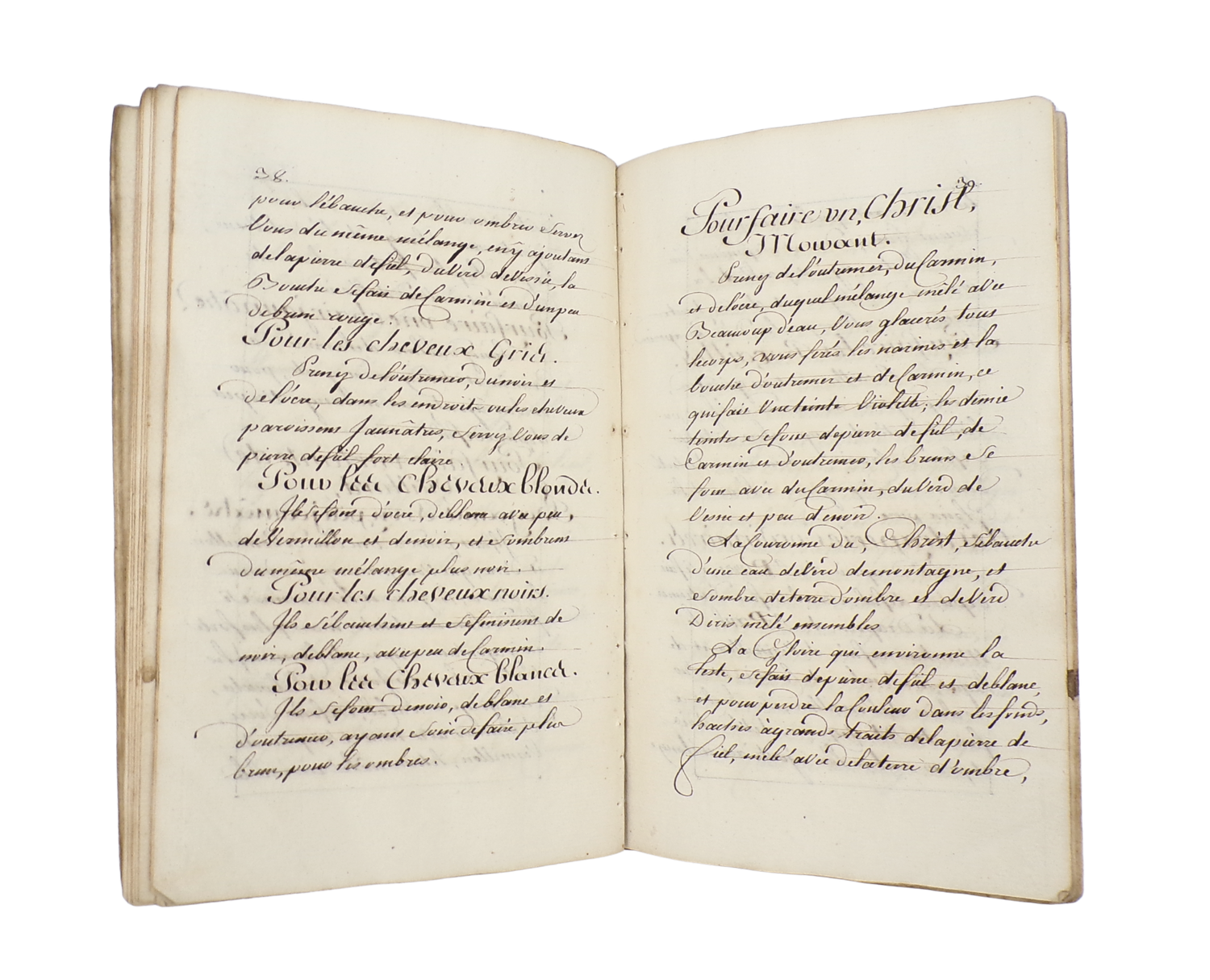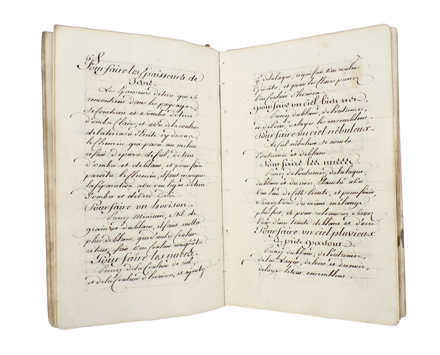 With its calligraphic titles, orderly layout, and two distinct hands, the work appears conceived as a study manual or aide-mémoire for an amateur or student intent on learning “without the help of a master.” It provides valuable testimony to the circulation and adaptation of painters’ technical knowledge from printed treatises into private manuscript practice in eighteenth-century France.