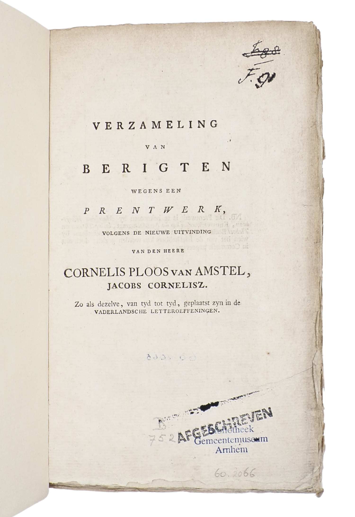Verzameling van berigten wegens een prentwerk, volgens de nieuwe uitvinding van den Heere Cornelis Ploos van Amstel, Jacobs Cornelisz.