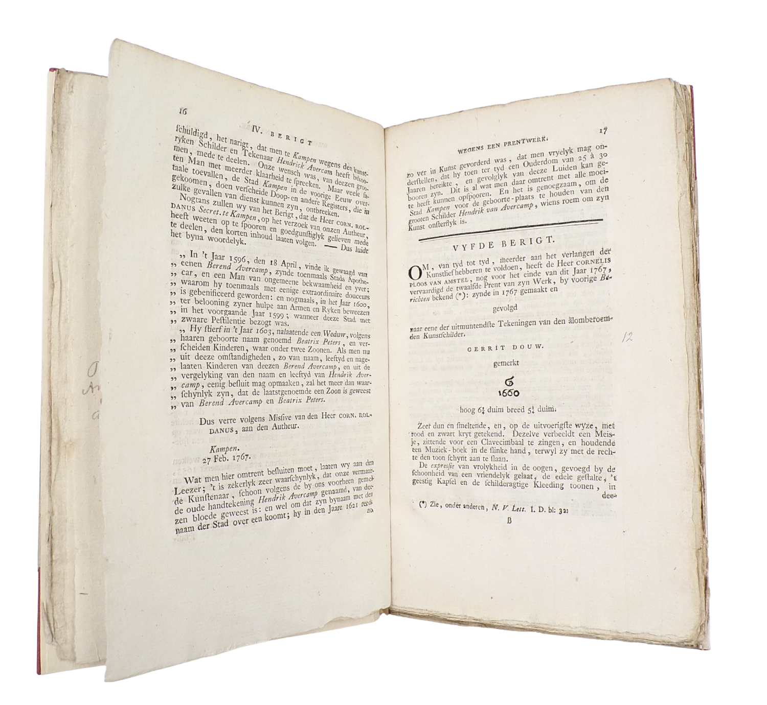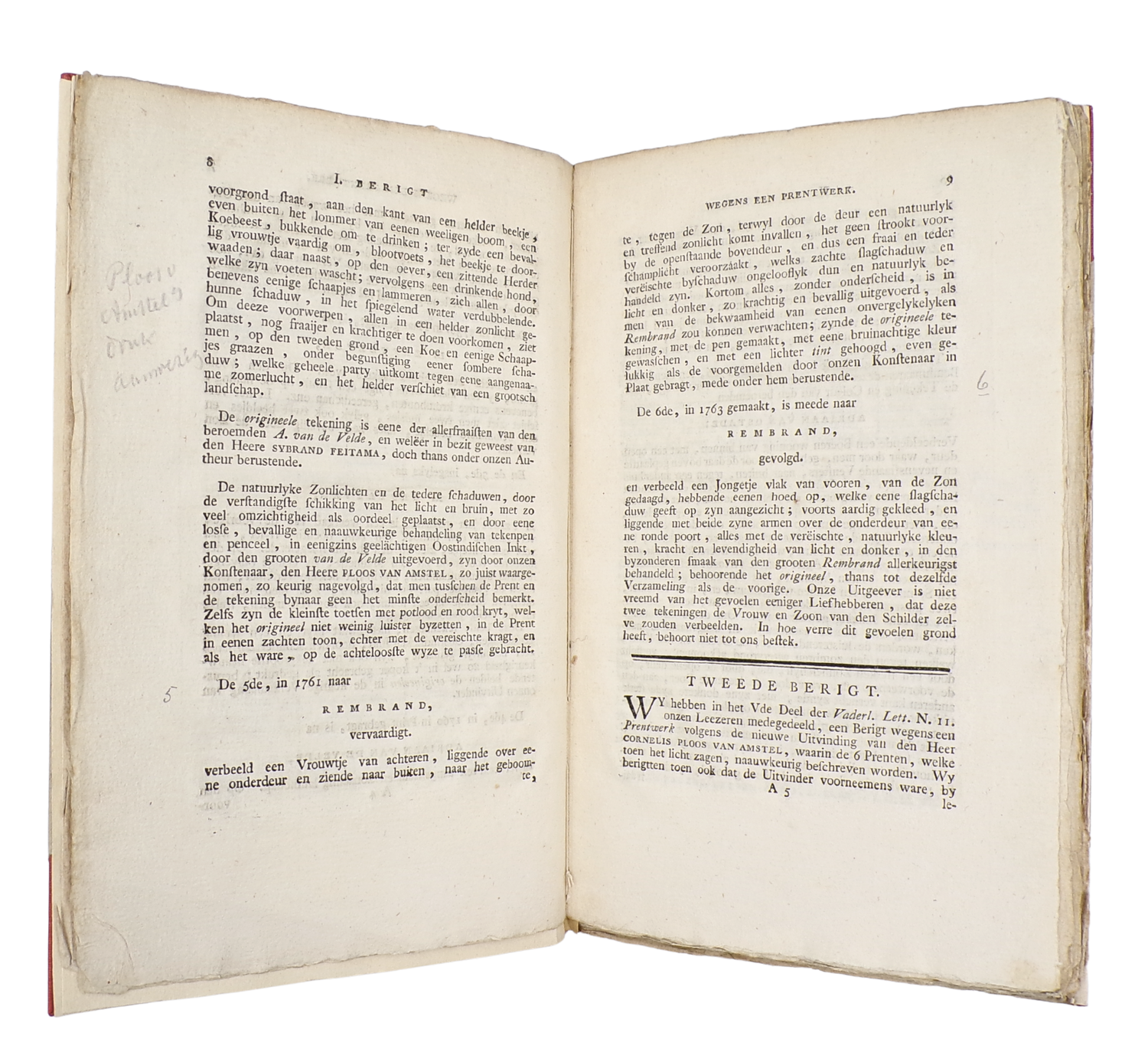 This is followed by eighteen Berichten (instalments), some with separate (part-)titles and pagination, containing detailed descriptions of thirty-six prints executed by Ploos van Amstel after drawings by leading Dutch masters such as Jan van Goyen, Rembrandt, and Lucas van Leyden. The Berichten are numbered 1-19, no. 17 is lacking in this copy. The prints are numbered consecutively from 1 to 36, no 30 misses in this copy. In addition to the technical and descriptive notes, Ploos van Amstel included short biographical sketches of the artists whose works he reproduced.