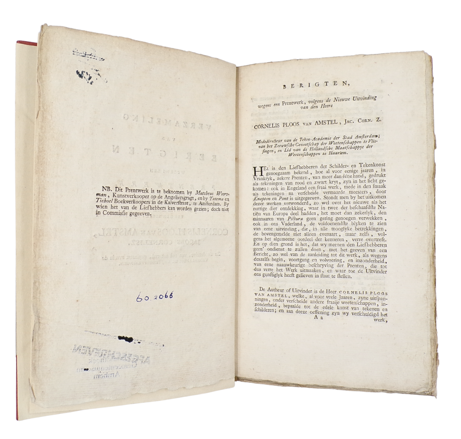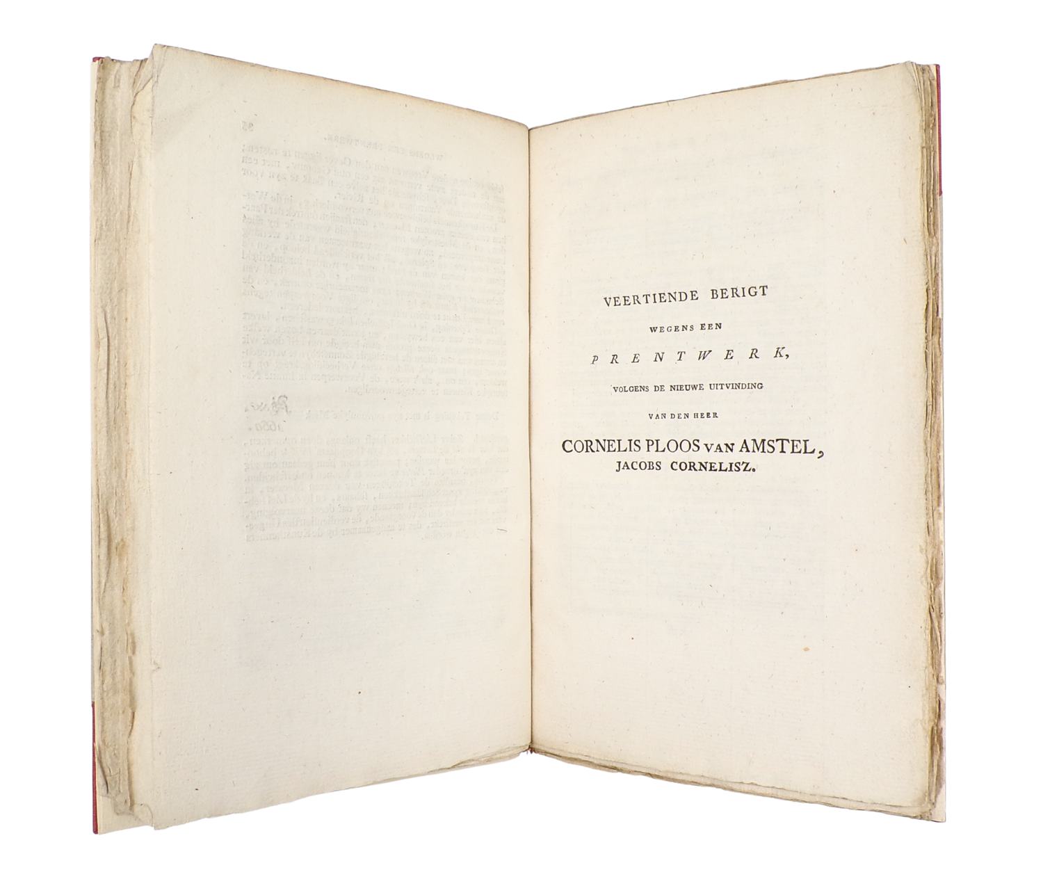 First edition of the introduction of a new printing method, invented by the author Cornelis Ploos van Amstel, a collector, scholar, and print innovator. His experiments in colour reproduction were widely admired by contemporaries and later recognized as precursors of 19th-century lithographic and chromatic processes. Today he is celebrated as one of the most inventive figures of the Dutch 18th-century print revival.