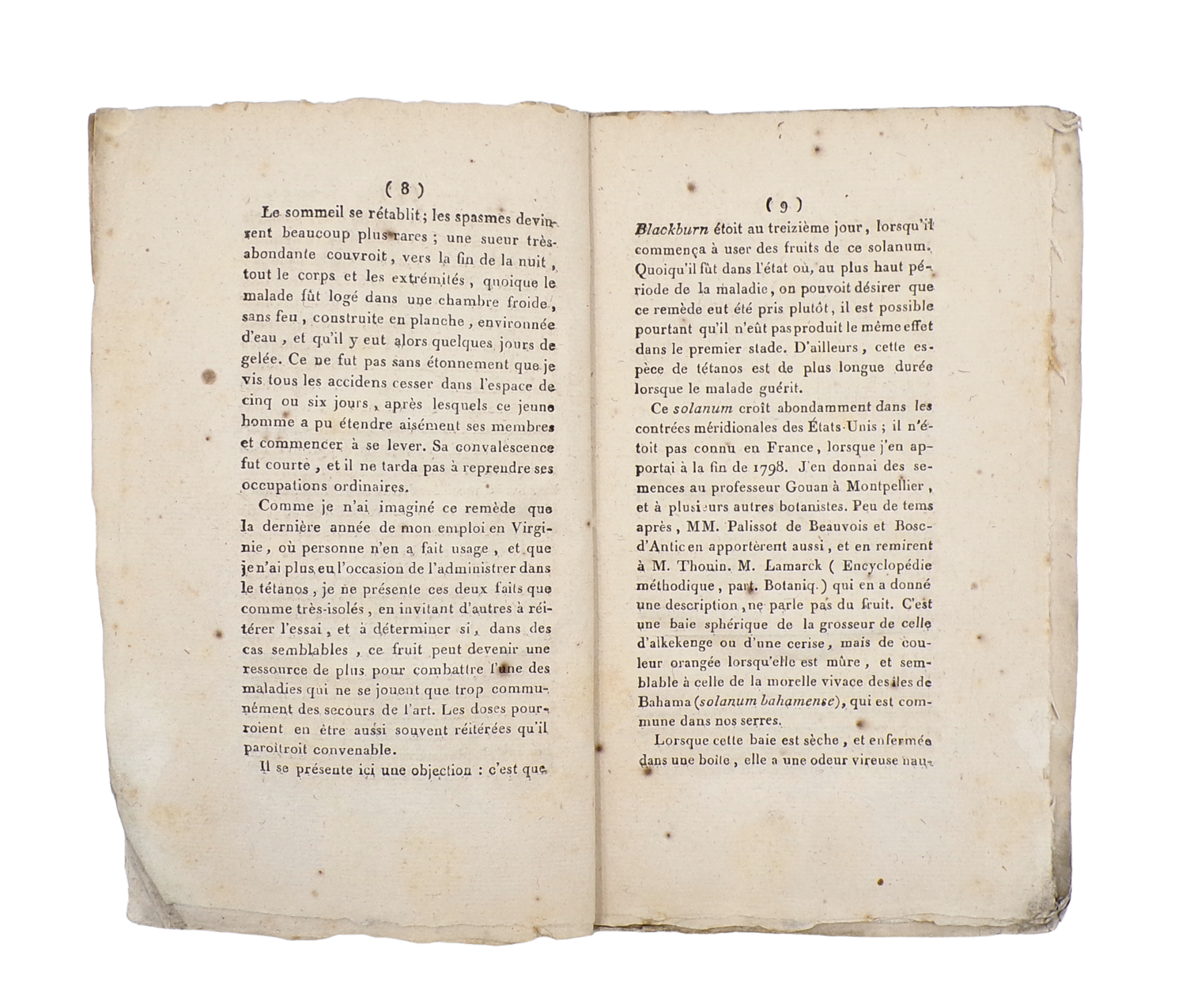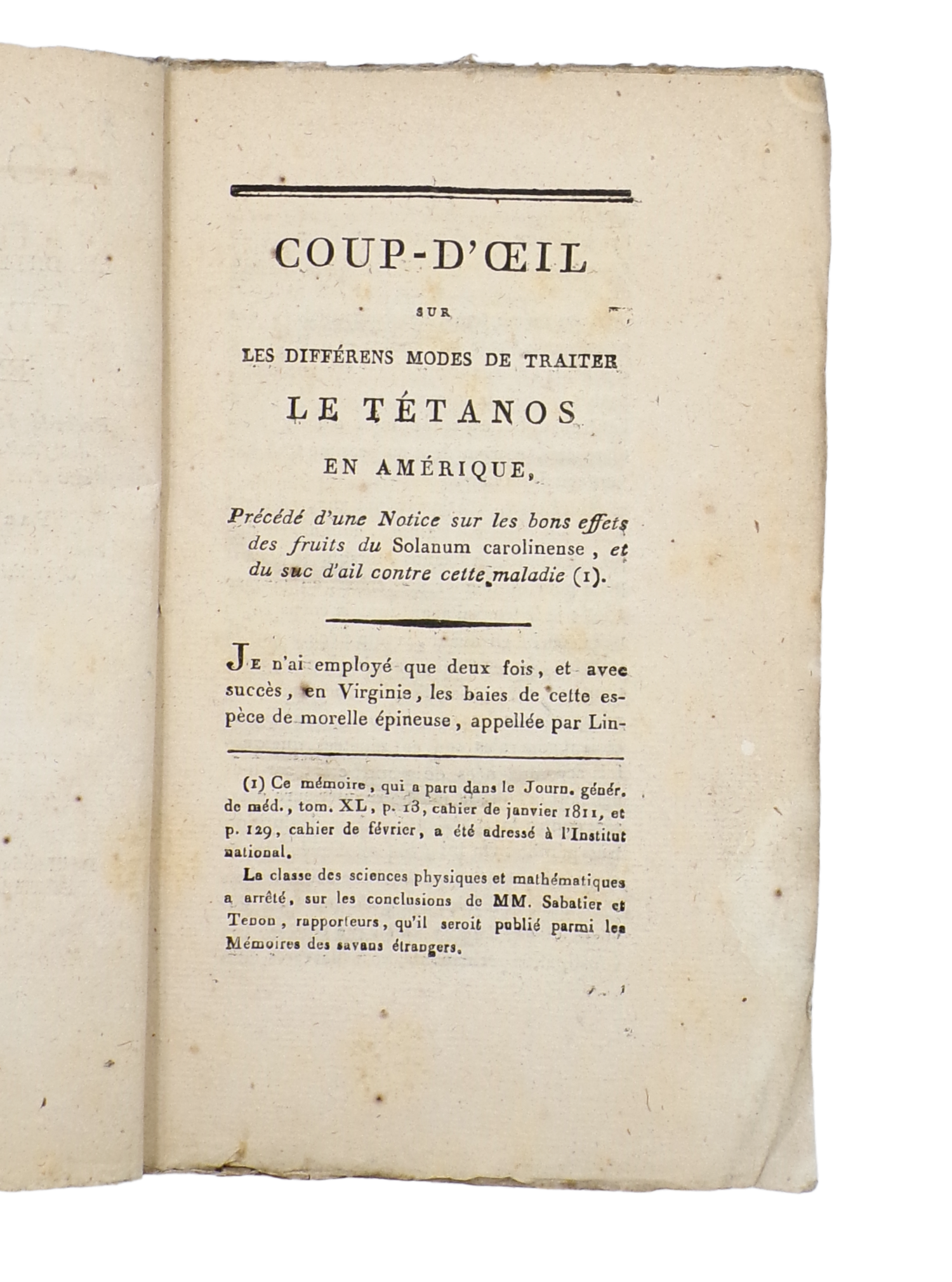 Rare first edition of this important treatise on tetanus by Louis Valentin, formerly chief physician to the French armies in Haiti (Saint-Domingue) and later director of the hospitals of Virginia. Valentin surveys the methods of treatment observed in America, and includes a particular notice on the virtues then attributed to Solanum carolinense and to garlic juice in combating the disease.