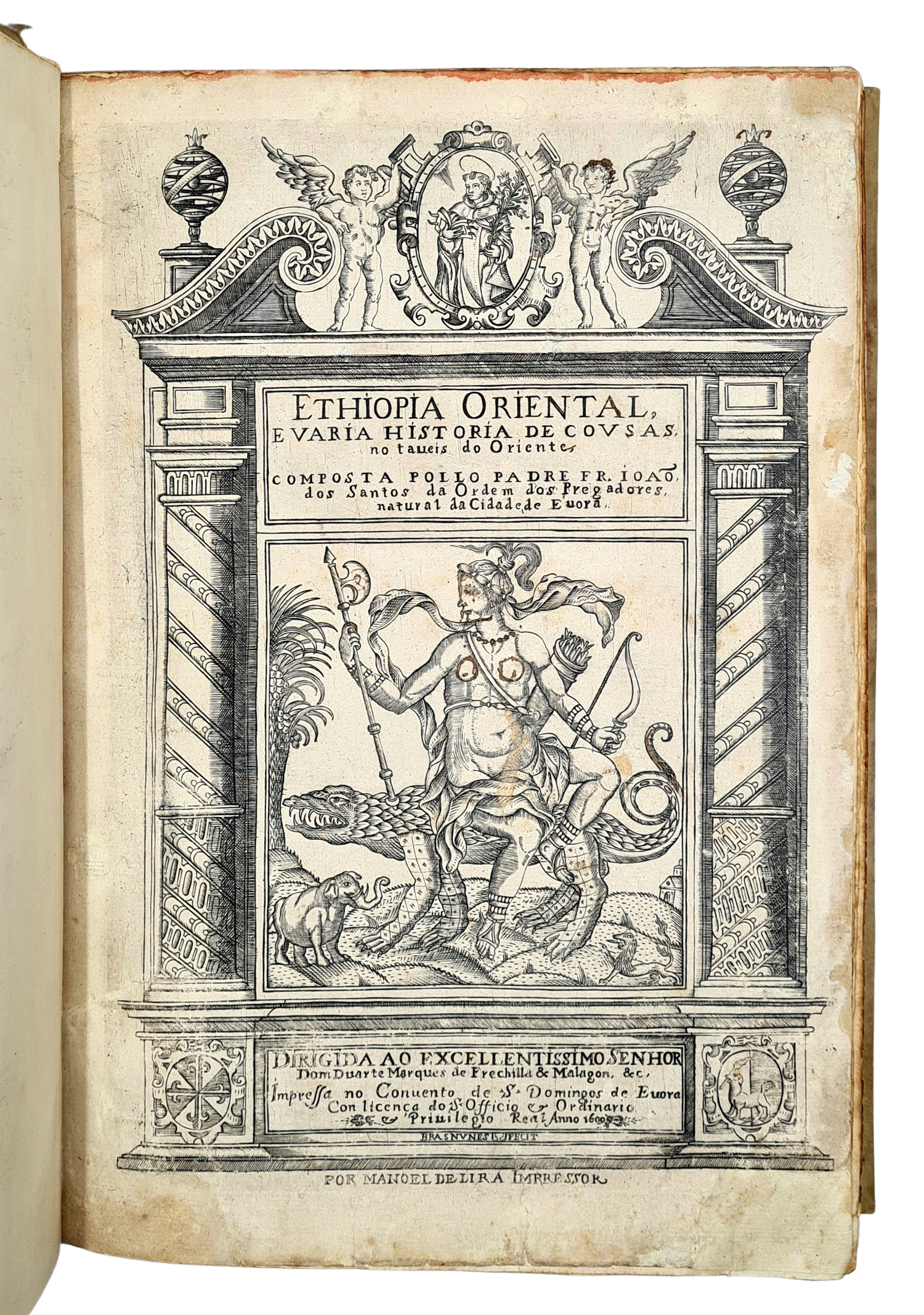 Vol. 1 with an engraved title-page depicting a female figure seated on a crocodile (dragon?), an elephant, a palm tree, a lion and a church in a landscape, surrounded by an architectural border with the image of Saint Dominic in a cartouche at the top. Signed Bras Nunes Fecit; vol. 2 with the title-page in a woodcut architectural border with two caryatids and an inset vignette with Saint Dominic and Madonna. Furthermore with several woodcut ornamental initials and head- and tailpieces.