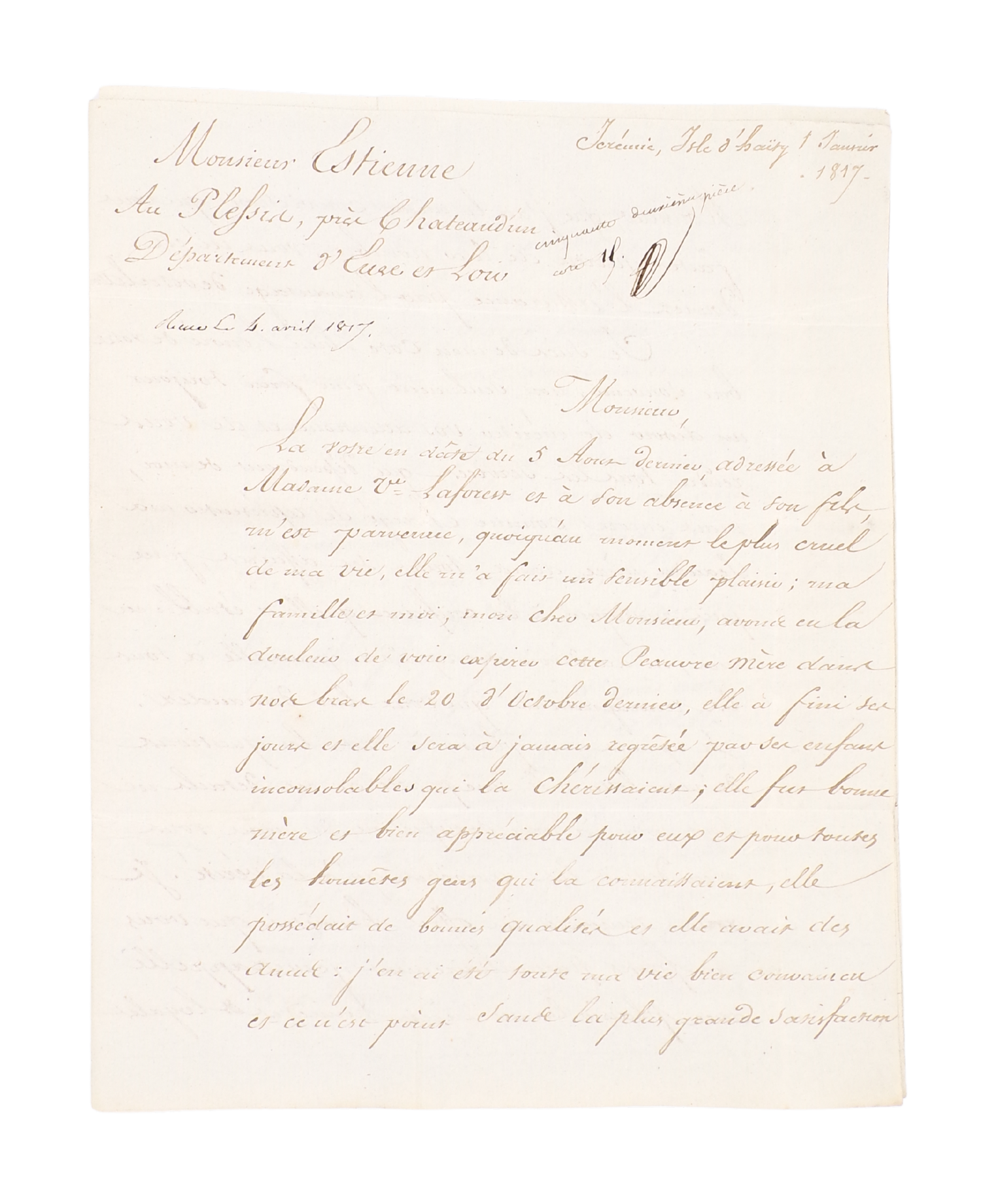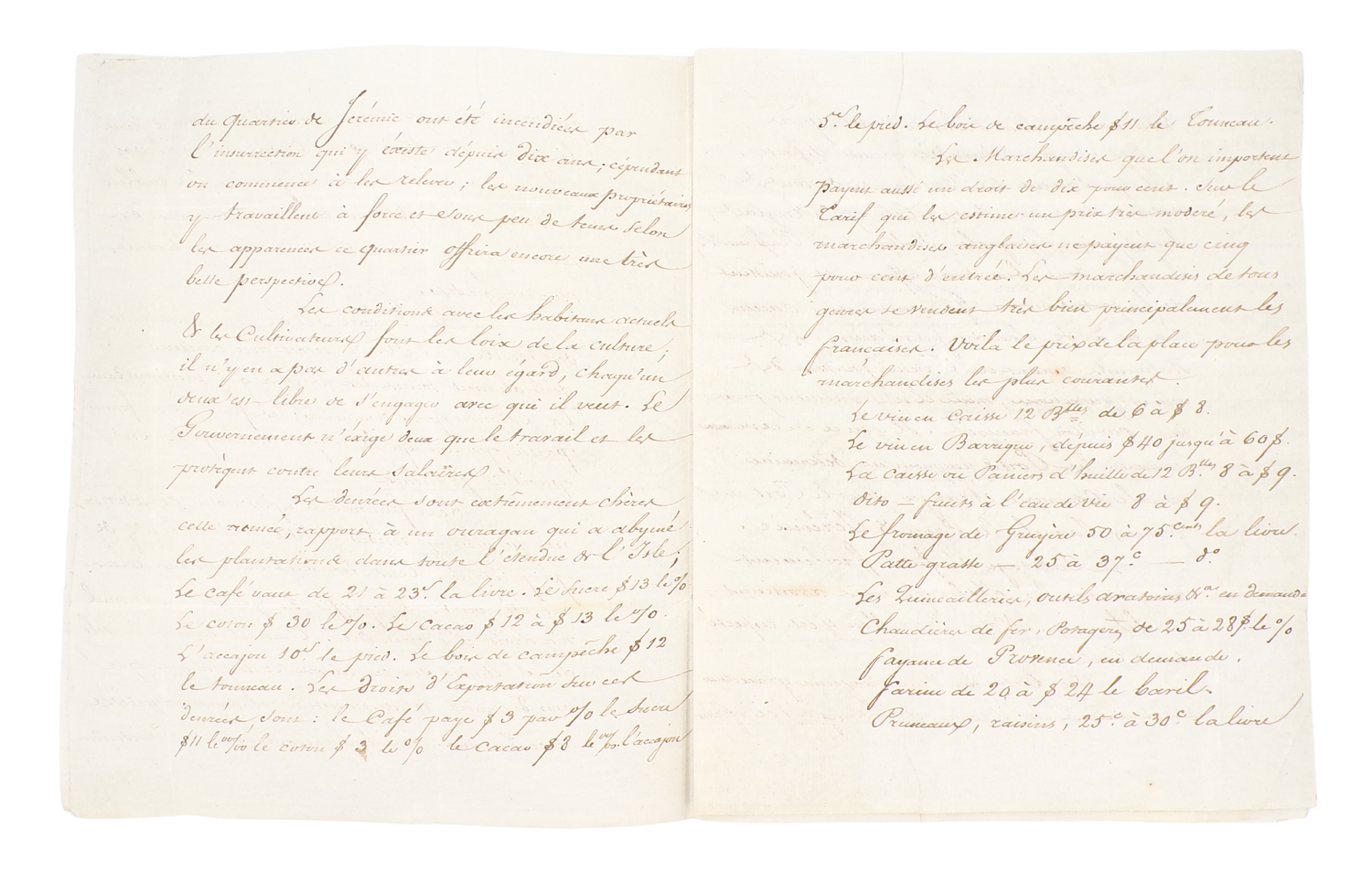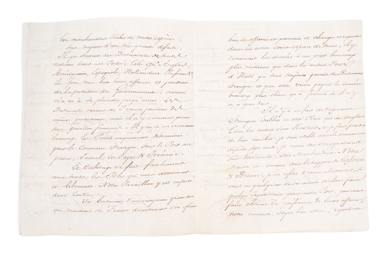 Manuscript account of trade in post-revolutionary independent Haiti by merchant Hippolyte Laforest, based in the southern port town of Jérémie. He proudly identifies himself as a Haitian citizen and co-founder of the trading house Laforest & Brière. He states explicitly that “all others [merchants] are Haitians and I am one of them.” Writing just over a decade after Haiti’s independence, Laforest offers a detailed and candid picture of commerce in the new Black republic under President Alexandre Pétion—welcoming to foreign traders, yet firmly closed to French colonial ownership.