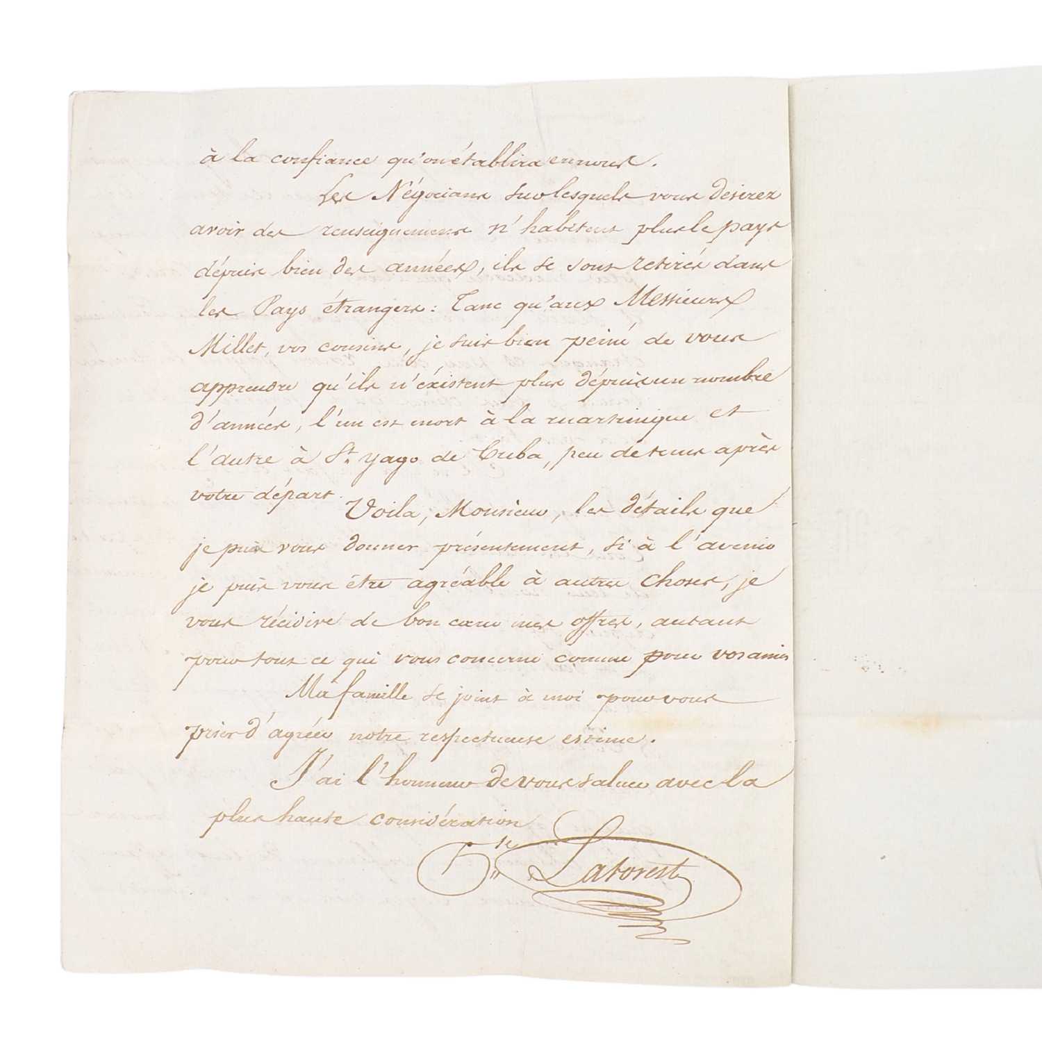 Concluding with an invitation to establish commercial ties, Laforest presents himself as a well-established Haitian trader engaged in consignments of both goods and ships. This manuscript source illustrates the economic self-determination of early independent Haiti and the emergence of a local Black merchant class asserting itself on the global stage.