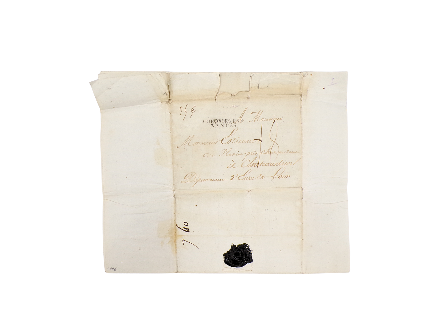 Unbound, folded. Complete with original address panel bearing postal markings “Colonies par Nantes,” black wax seal (partially intact), and manuscript routing instructions.
