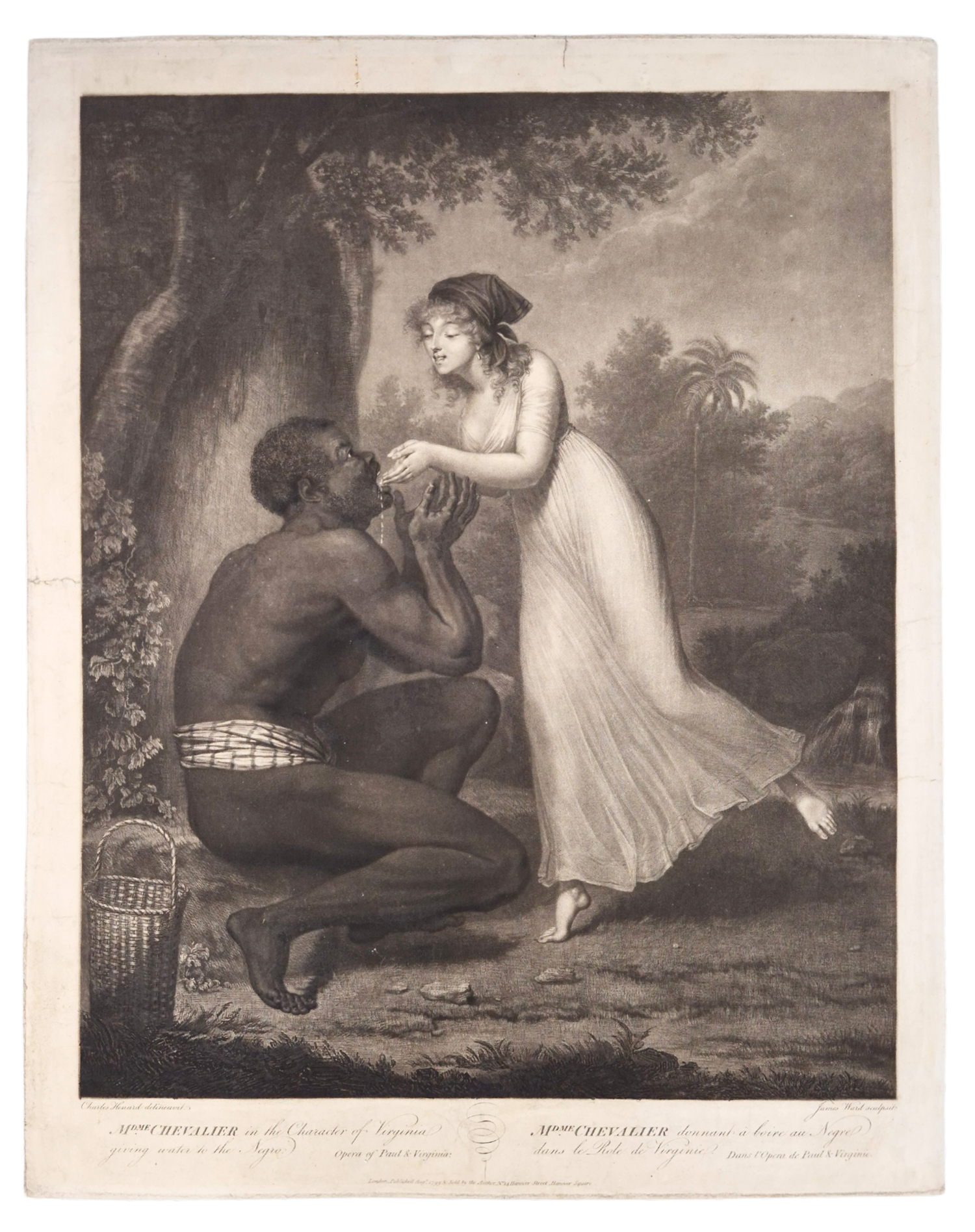 A scene of compassion and a display of inequality, this mezzotint shows the actress and singer Louise Chevalier (c. 1770–after 1801) in the role of Virginie, in a scene from the opera Paul et Virginie. The story, written by Jacques-Henri Bernardin de Saint-Pierre and first published in 1788, tells of two children raised together in colonial Mauritius. Its portrayal of innocence, nature, and colonial life, including encounters with enslaved or Black characters, fascinated European audiences and made the work enormously popular, inspiring numerous theatrical adaptations. The particular scene depicted here was most likely taken from the opera composed by Jean-François Le Sueur and first performed in 1794.