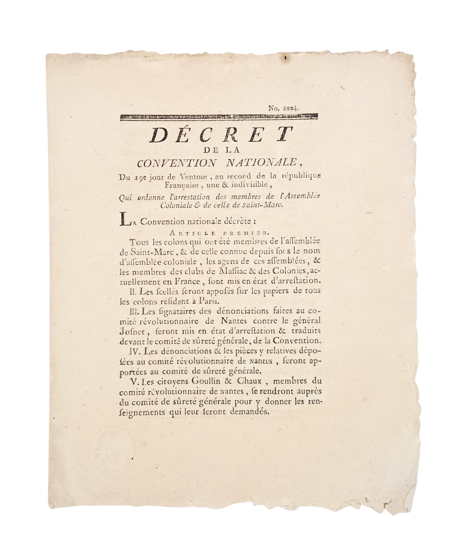 Décret de la Convention Nationale du 19e jour de Ventose, an second de la République Française, une & indivisible, qui ordonne l'arrestation des membres de l'Assemblée Coloniale & de celle de Saint-Marc.