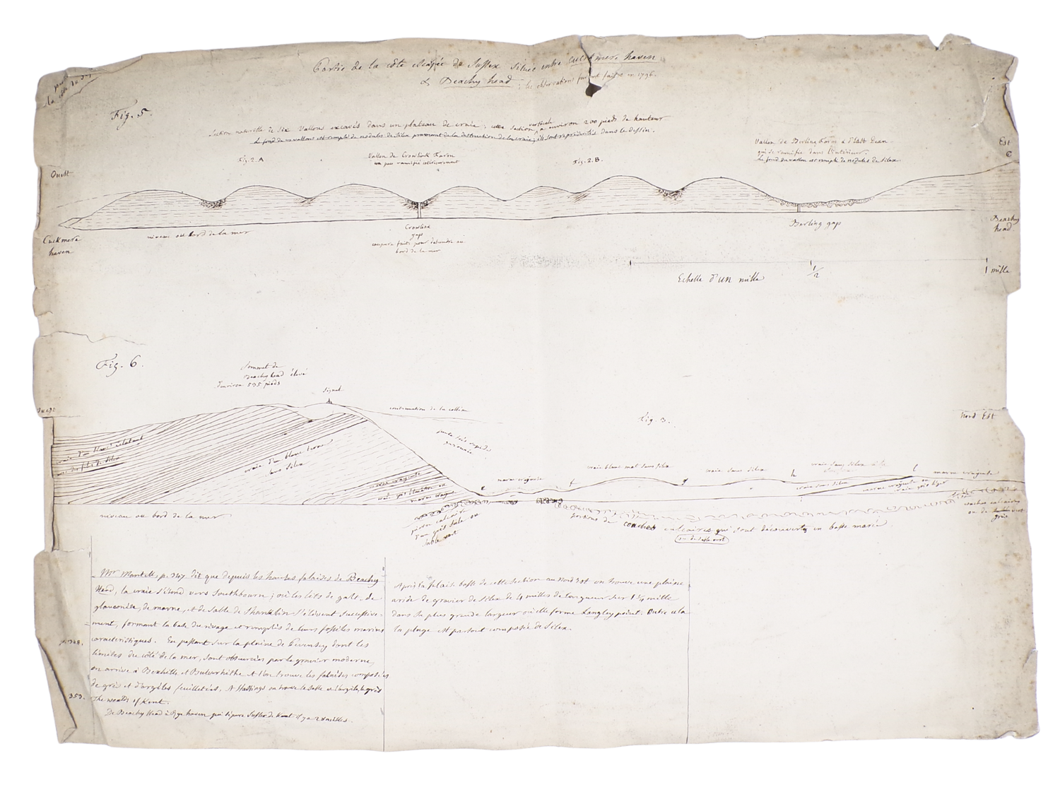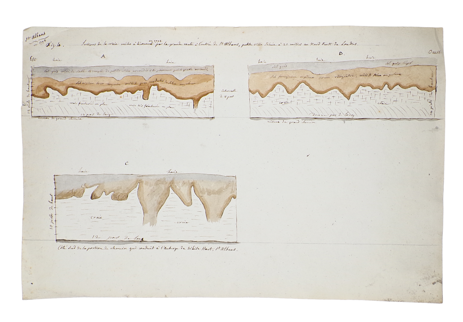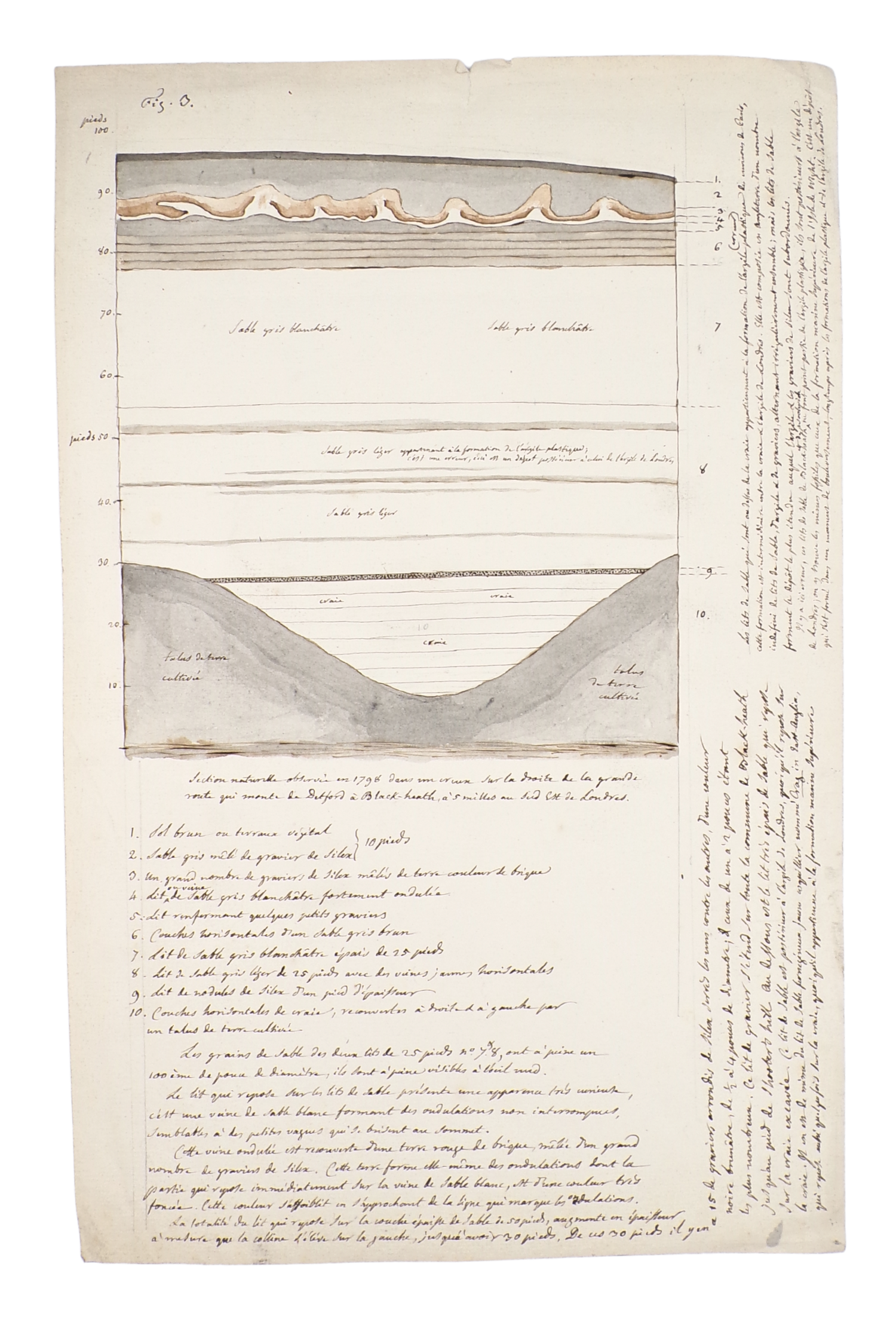 The sheets record specific outcrops at Blackheath, Charlton and other sites around London, a long traverse from Sheffield to Castleton, parts of the Sussex coast between Cuckmere Haven and Beachy Head, and other British localities. Many bear explicit notes such as “observé en 1798” or “observations faites en 1796”, and combine landscape views with stratigraphic cross-sections and measured thicknesses. These localities do not correspond to any known published geological plates of the period, and the drawings display original analytical features—multiple views of the same ravine, corrections where earlier attempts are crossed out as “ce dessin n’est pas correct”, detailed French commentary and careful field-based dating—that show they are not copies from print but independent geological work. Interestingly, some of these sheets bear British watermarks.