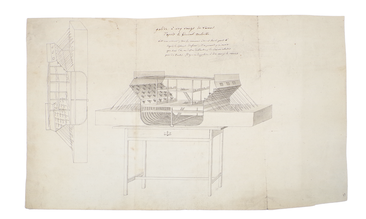 The remaining drawings document instruments and fortifications: a detailed elevation of Herschel’s forty-foot telescope, a five-bank galley “d’après le Général Melville”, and two sheets on Vauban’s first system of fortification, one annotated “dessiné à Woolwich en 1799” and inscribed “Wm Bowyer”. Together they testify to the breadth of Deluc’s technical and scientific interests.