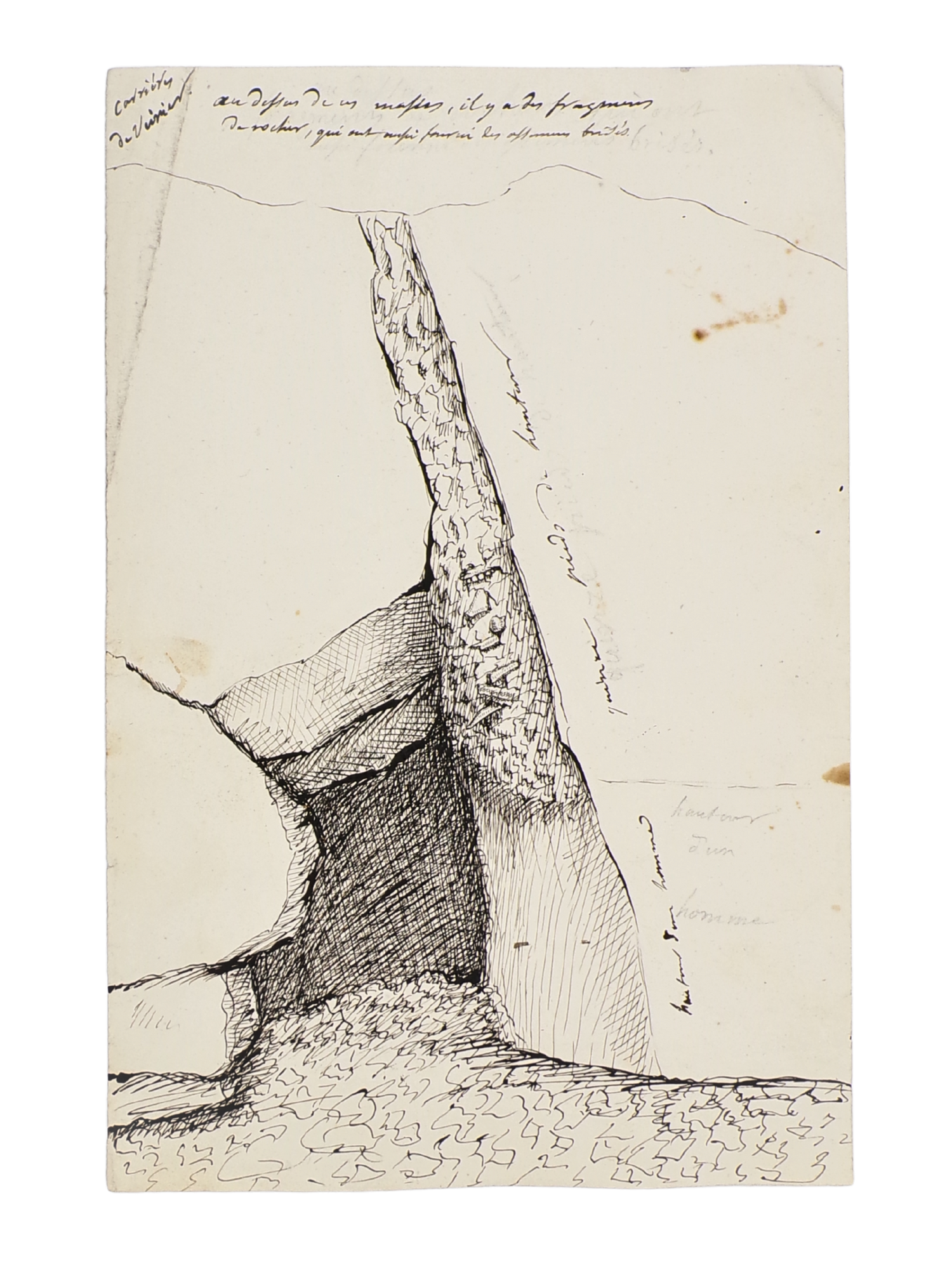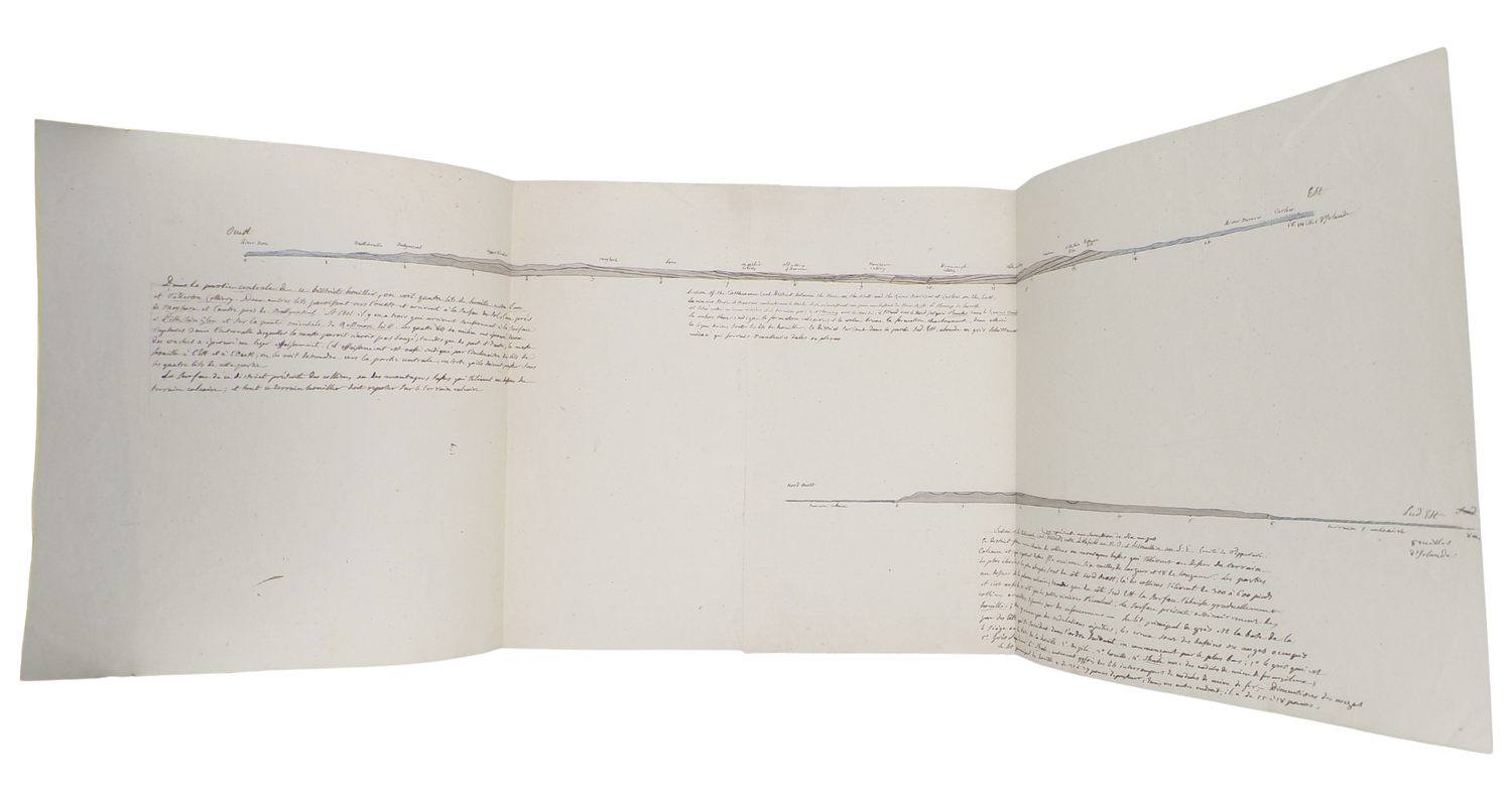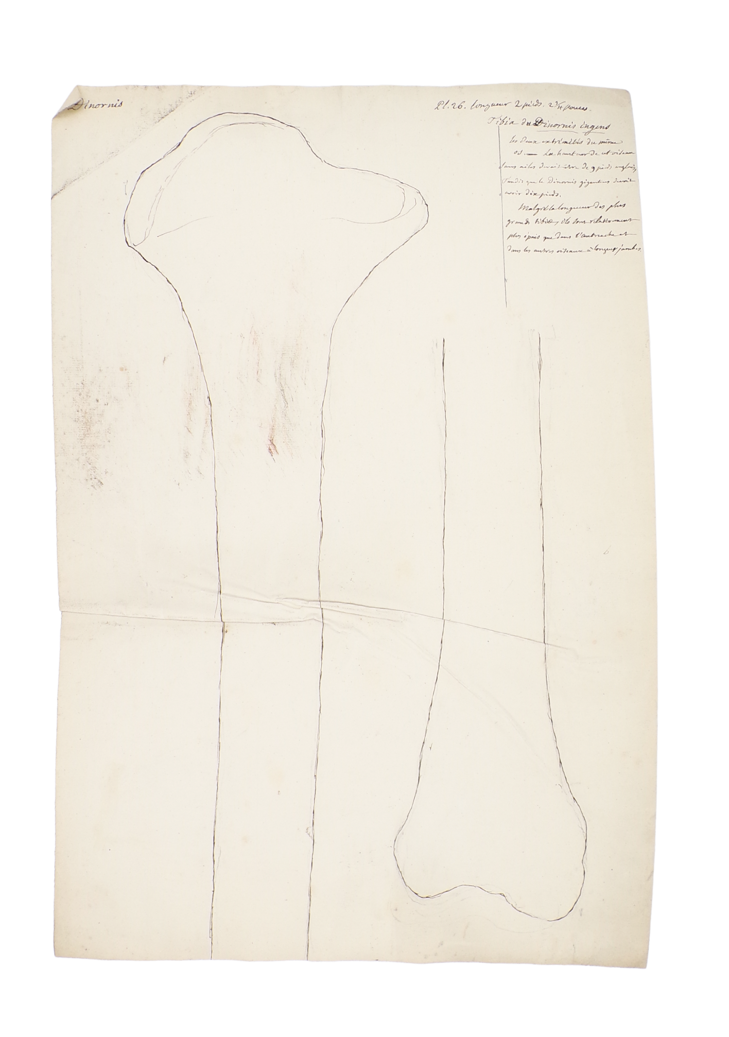 The small group of palaeontological sheets includes lithographed plates from the Transactions of the Geological Society with Deluc’s marginal notes, as well as large pen-and-ink drawings of the skeleton of a Megatherium unearthed near Buenos Aires and of bones of the giant birds Dinornis ingens and Dinornis giganteus, all with neat French descriptions. These demonstrate his interest in the new fossil vertebrates that were reshaping ideas about Earth history.