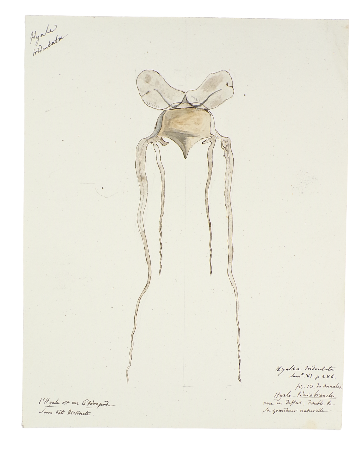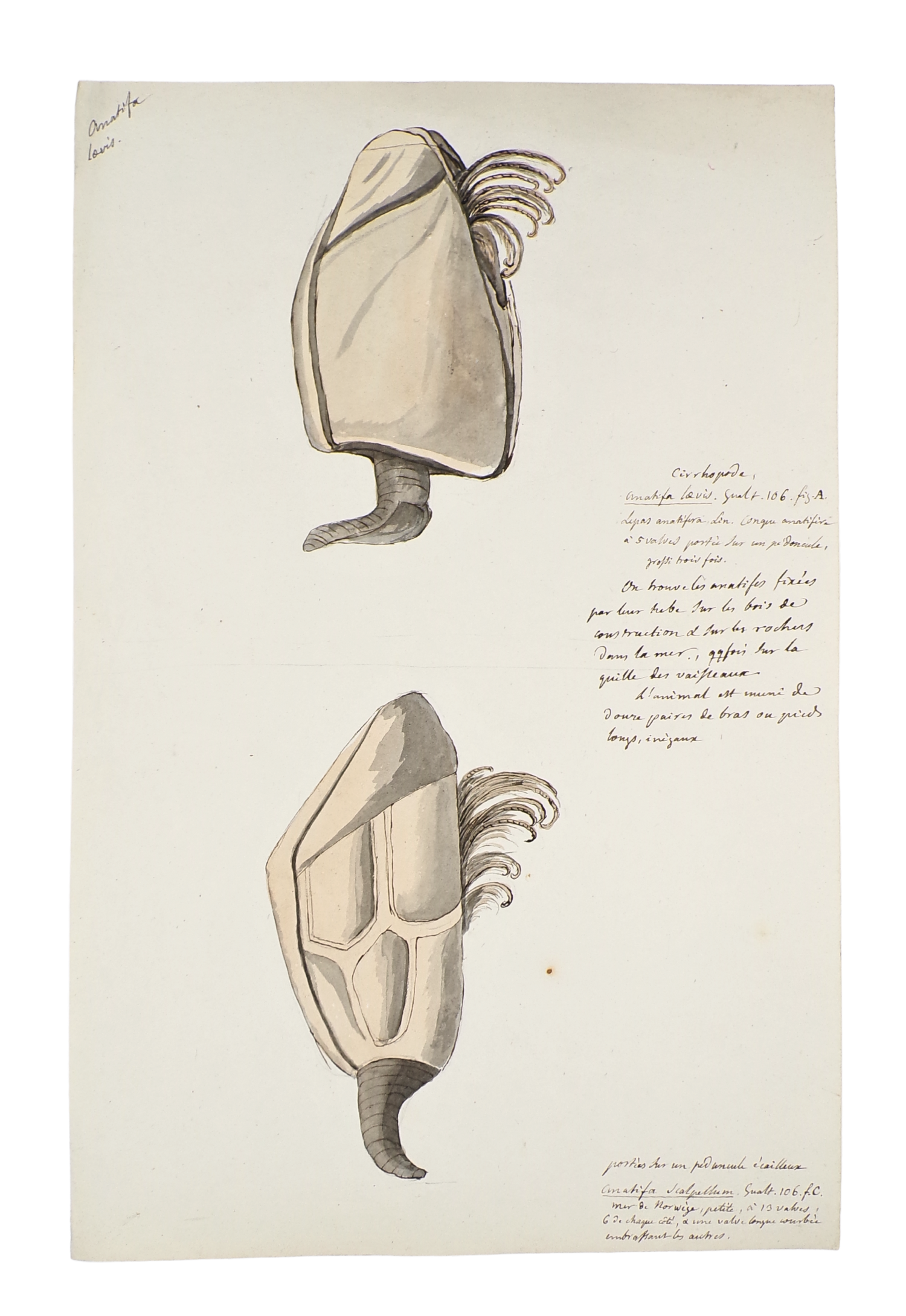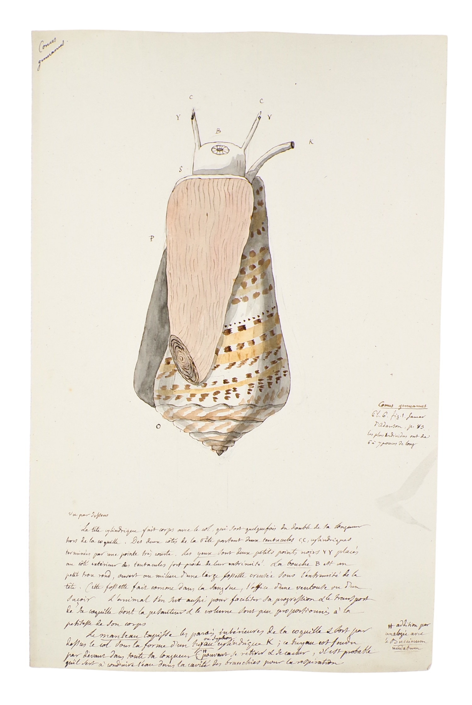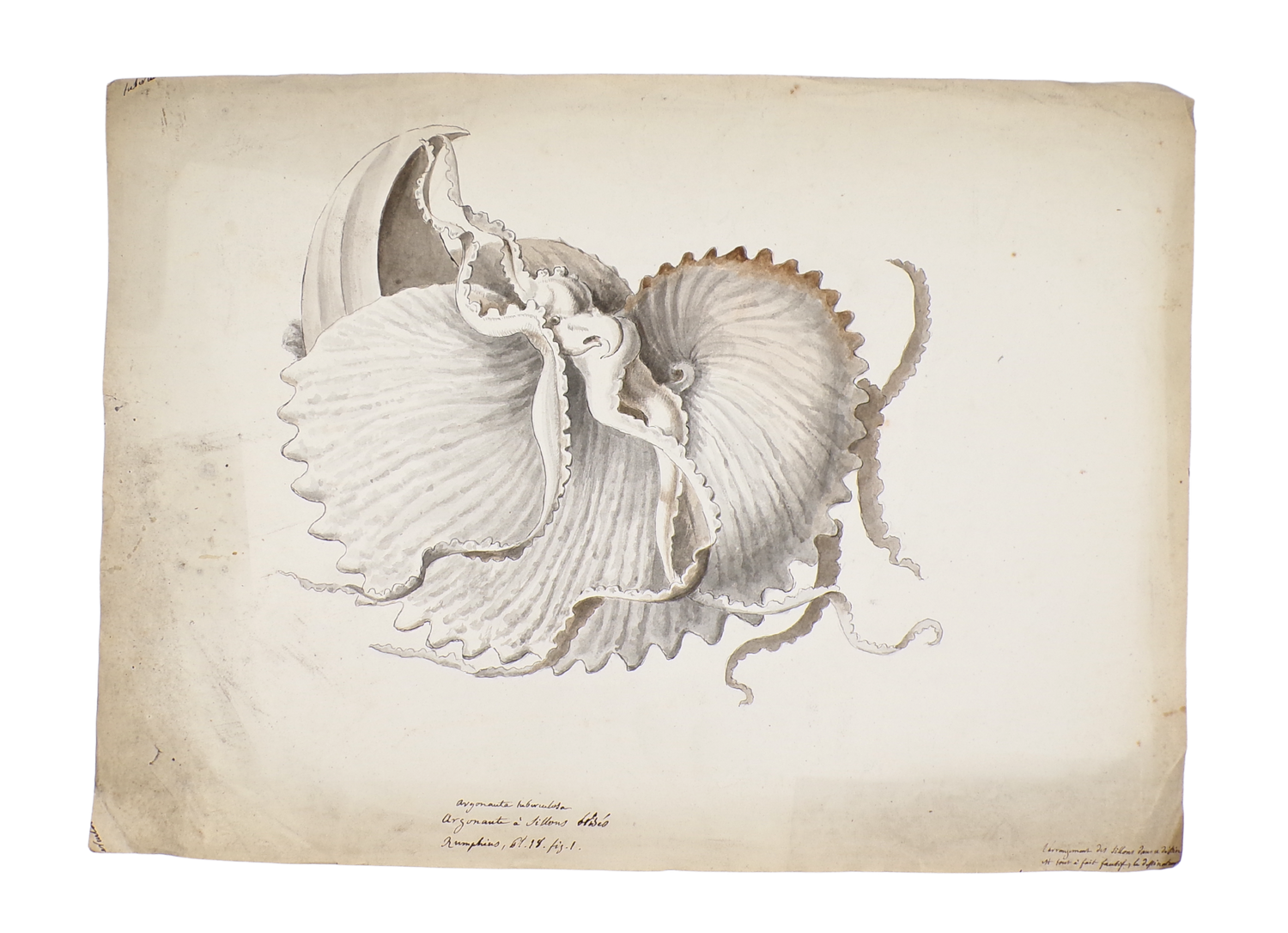 The mollusc drawings are meticulous studies of shells, cephalopods and other marine organisms, often larger than life and delicately coloured. Many are explicitly copied from standard works by Rumphius, Adanson and others, with the sources carefully cited (plate and figure numbers, page references) and supplemented with Deluc’s comments on classification and comparative anatomy. Two manuscript text leaves (“Mollusques divisés en dix classes” and notes from a séance of 30 March 1822 on cephalopod classification) show him engaging with early-nineteenth-century systematic zoology.