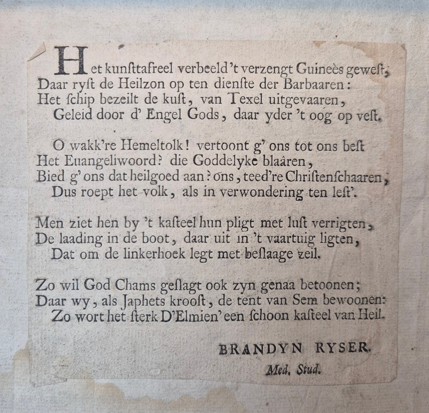 In connection with his mission, his friend Brandyn Ryser commissioned this portrait, made by François van Bleyswijck. Here, Capitein is depicted according to the conventional iconography of a Protestant scholar and minister of his time. However, the caption by Brandyn Ryser immediately reinforces the racial stereotype: an African Moor who, despite his black skin, has a white soul. After noting that Capitein was now an ordained minister in Elmina, the accompanying poem describes his goal there: to make the people "white" by bringing them the Faith. Five years later, in 1747, he passed away.