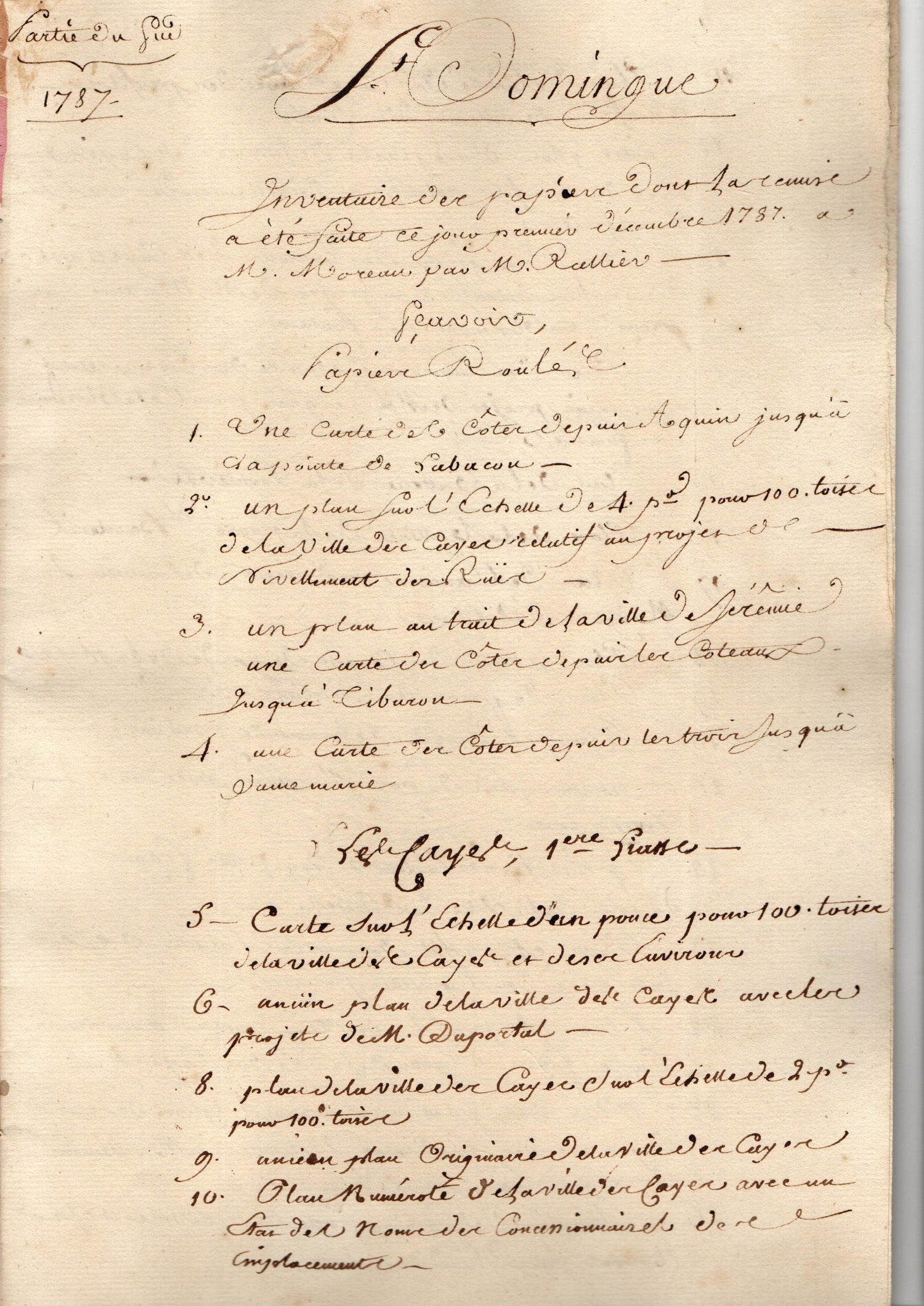 • Reports, drawings, and administrative records from the southern engineering office, including plans of Les Cayes and the 1787 inventory of the cartographic papers held by the office.