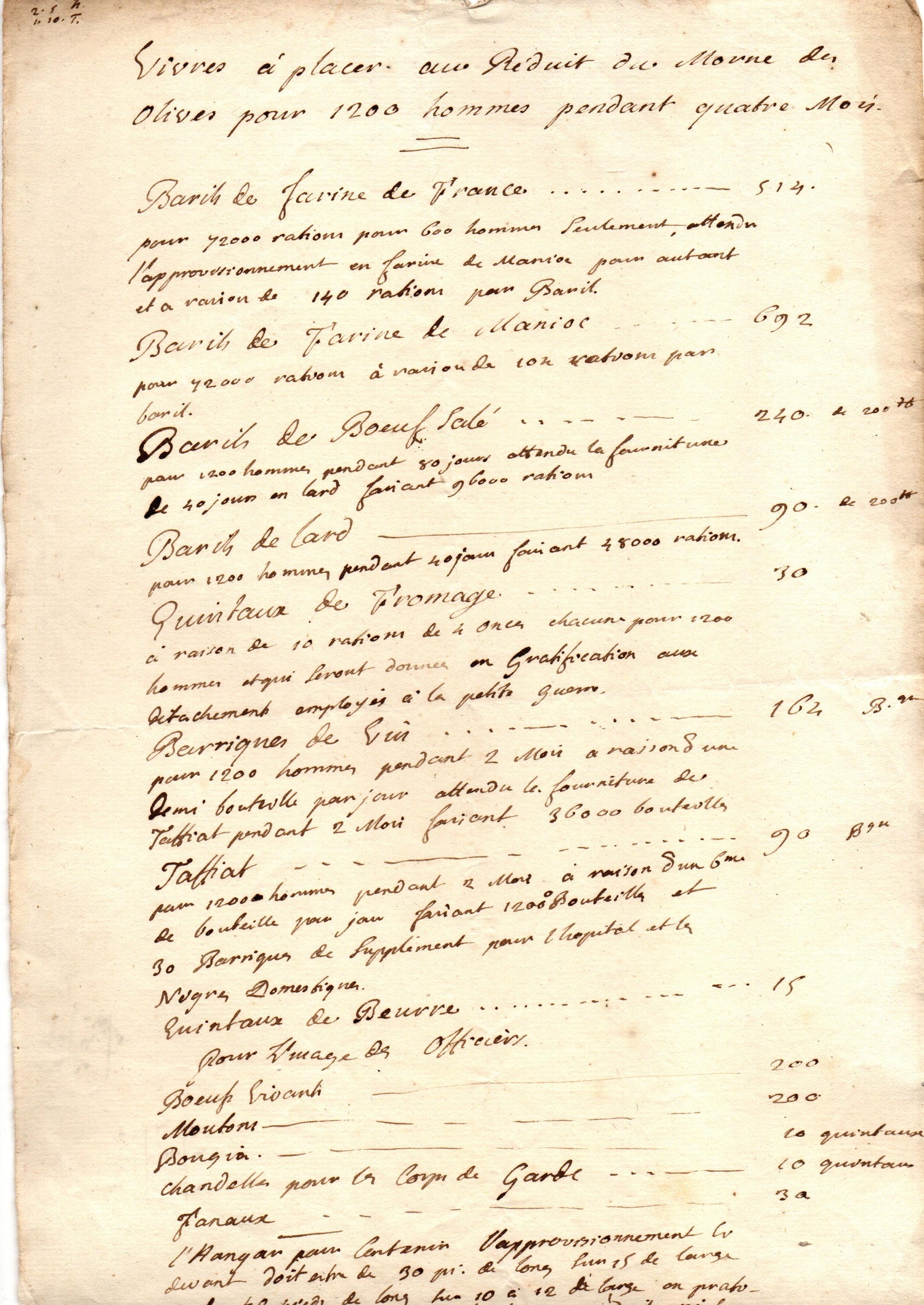• Vivres à placer au Réduit du Morne des Olives pour 1200 hommes pendant quatre mois.