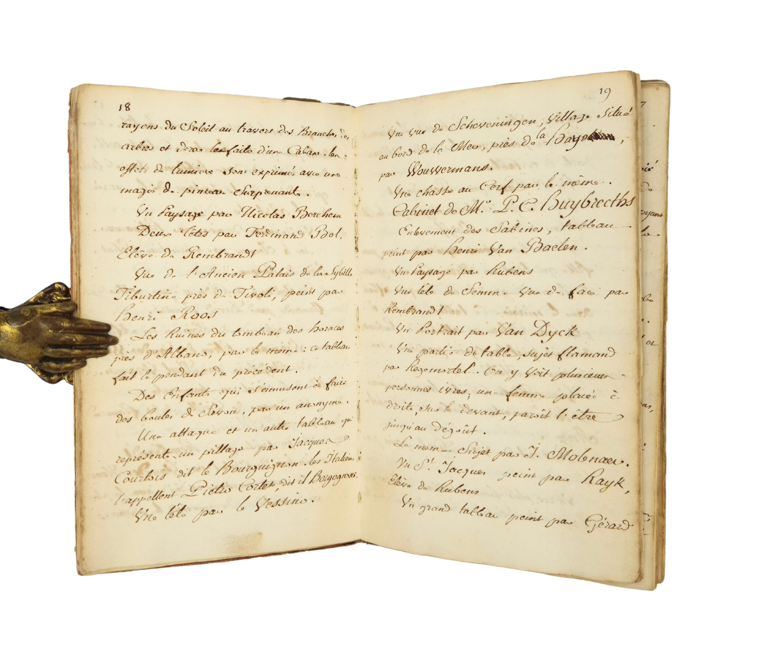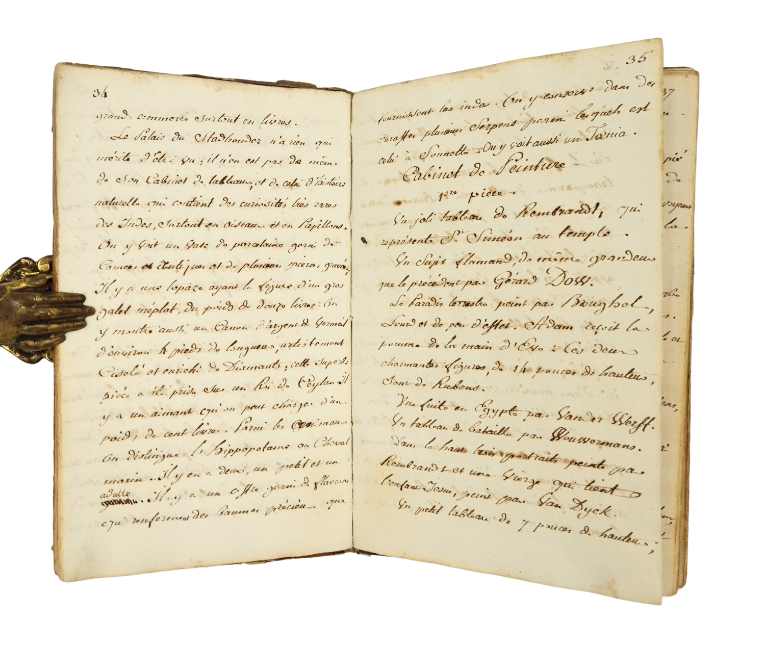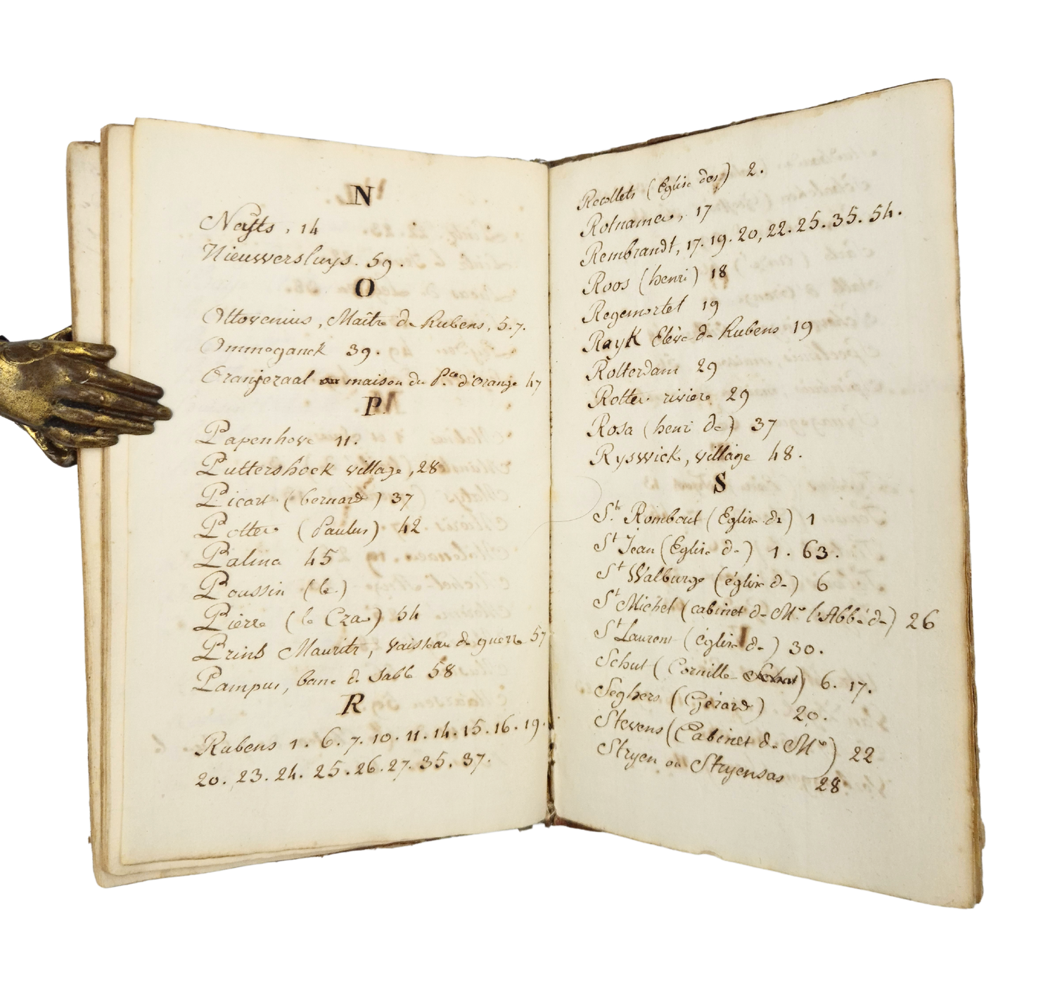 The principal focus of the journal is the viewing of paintings, which appears to have been the main purpose of the journey. Numerous individual works by Netherlandish and foreign Old Masters are recorded with name, title and often subject description. Of particular interest are the visits to privately owned cabinets, such as that of the art dealer P. C. Huybrechts, which contained “Un St. Paul par Rembrandt” and a long description of “un des plus fameux tableaux du Corrège (Corregio)”. While in the most beautifu;l city of The Hague the author visited the painting collection in the “Stadhouderlijk Paleis”, listing numerous works preserved there. At the end there is an index referring to the artists whose works are mentioned in the manuscript.