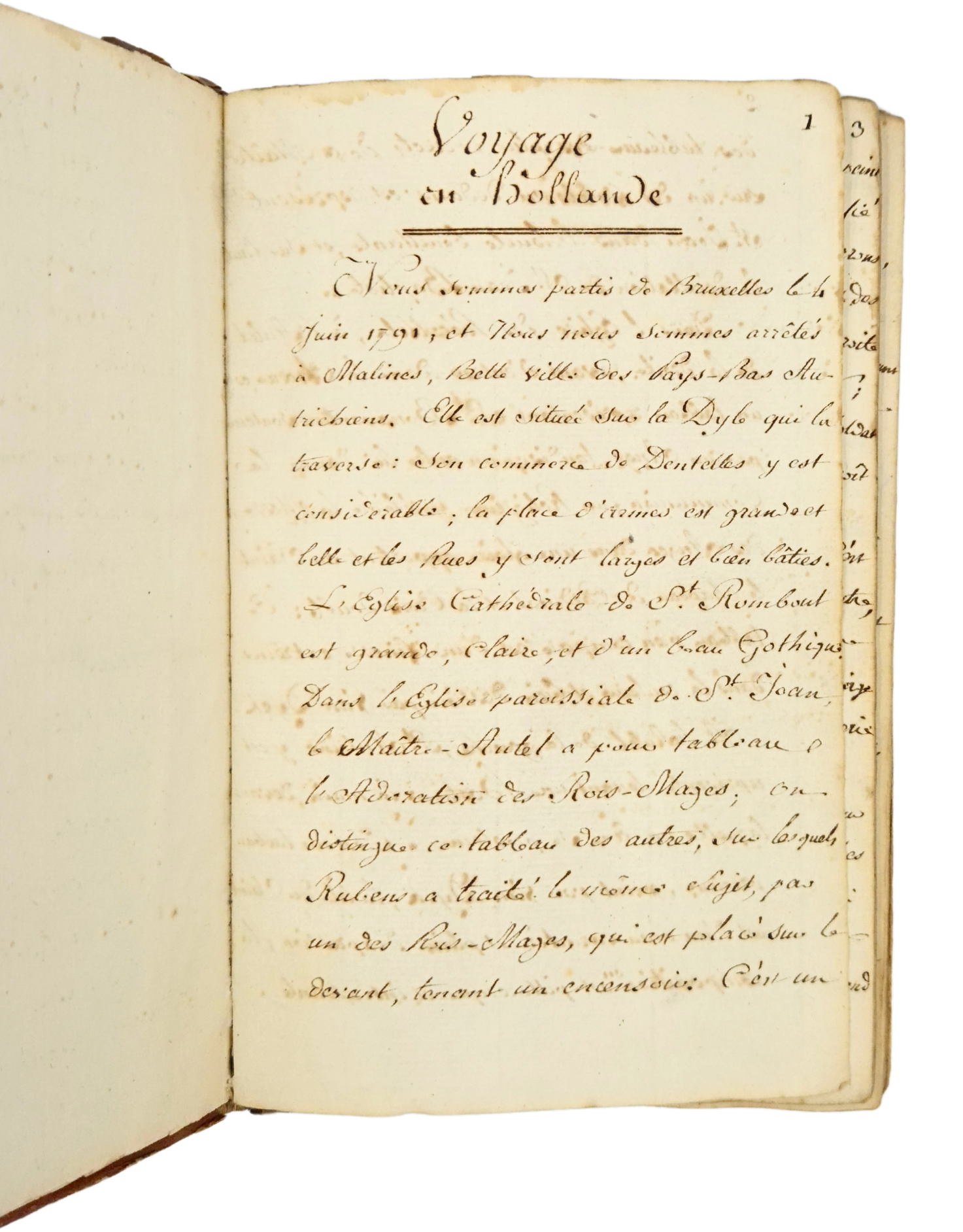 Manuscript diary of a connoisseur describing a journey through the Netherlands, begun in June 1791, with visits to numerous important painting collections. The journey begins and ends in Brussels, making it likely that the anonymous author was a resident of that city. It recounts visits to places in present-day Belgium (Mechelen and Antwerp) before continuing through Holland with visits to Rotterdam, The Hague, Leiden, Amsterdam, and other places.